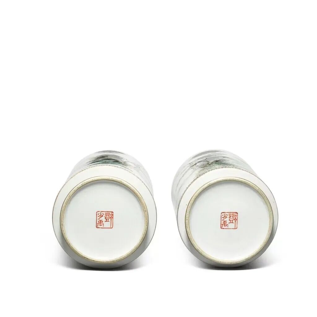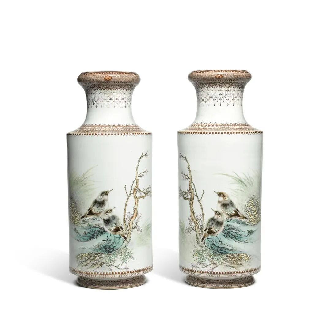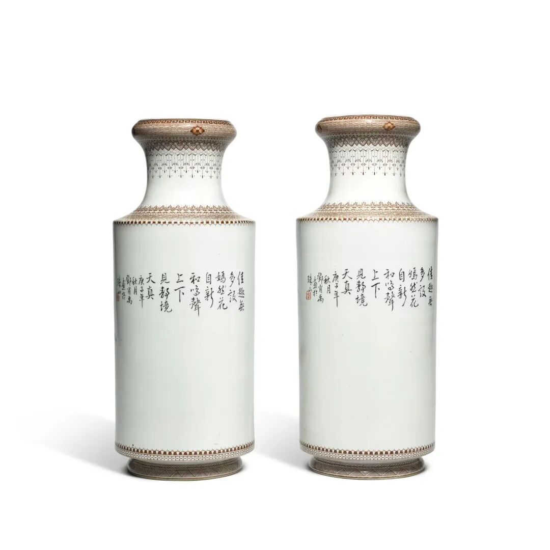 彩绘花鸟诗文圖瓶一对 《邓肖禹款》