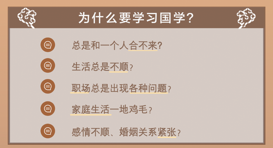 国学课程开设以来,我们结识了数以万计的学员朋友。汇总大家学习的初衷,主要是:职场晋升、财富升级、情感幸福。
