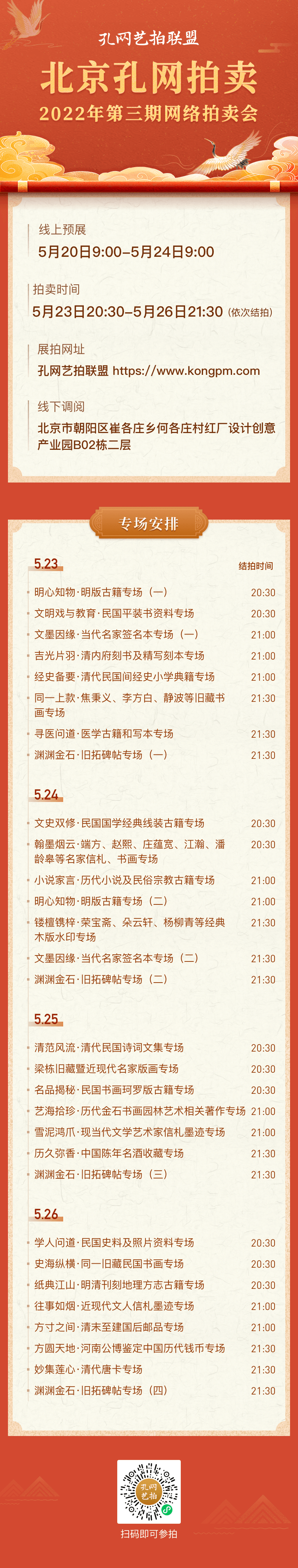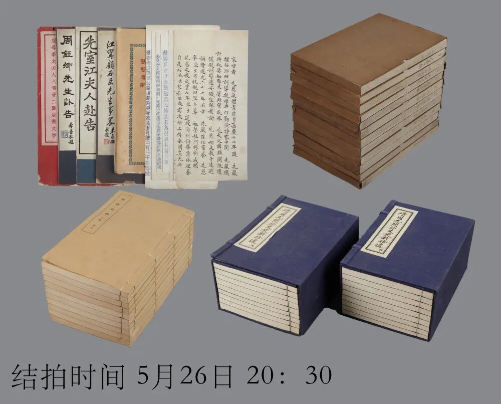 本专场精选民国史料文献、工具书及照片资料共35件拍品。民国史料类中,LOT546清至民国讣告一组,内有清代讣告十种、民国六种,其中不少为木刻蓝印,保存完好,流传稀少,是不可多得的人物传记资料;LOT547《英轺日记》为固山贝子载振作为清廷专使,出席英王加冕典礼时的游记,实为晚清学者唐文治代笔,流传不多;LOT551《千百年眼》属中国人在海外刊刻汉籍之罕见者,此书刊者王惕斋明治10年于东京创设“凌云阁”,其所刊汉籍目前仅发现四种。工具书类中,LOT557《西谛书目》仅印行600套,流传绝少,著录郑振铎先生收藏古籍7740部并题跋173篇,是研究古籍版本及古代文学史的重要资料;LOT563《陶瓷大系》全书共48册,按瓷器类别分门别类予以介绍,附有插图8333张,其中彩图3212张,一书在手,古今瓷器当可一览无余。照片资料中,LOT577为民政部副部长张邦英旧藏照片,共八张附有资料照片五张。