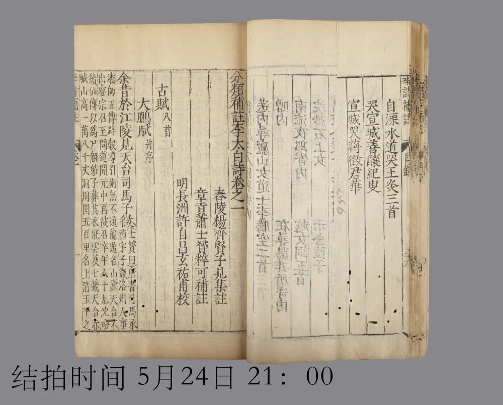 此专场为明版专场二,依然全是明版刻书。我们希望人人都可以买的起,藏的起明版书,让更多人体会古书之美和收藏的乐趣。故而对于版本的描述和考证都很严格,征集的起拍价也能控制到低于市场价,所以书友和藏家可以放心参拍。本场共计18件拍品,其中LOT304为明万历许自昌本《分类补注李太白诗》书林名品,《西谛书跋》著录郑振铎曾在上海收得一部,甚为欣慰,更希得一杜工部以成双壁。