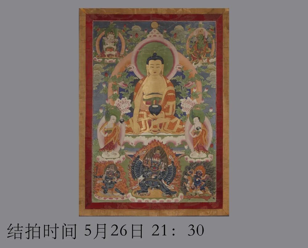 唐卡(Thang-ga),系藏文音译,指用彩缎装裱后悬挂供奉的宗教卷轴画,是藏族文化中一种独具特色的绘画艺术形式。具有鲜明的民族特点、浓郁的宗教色彩和独特的艺术风格,用明亮的色彩描绘出神圣的佛的世界;颜料传统上是全部采用金、银、珍珠、玛瑙、珊瑚、松石、孔雀石、朱砂等珍贵的矿物宝石和藏红花、大黄、蓝靛等植物,以示其神圣。这些天然原料保证了所绘制的唐卡色泽鲜艳,璀璨夺目,虽经几百年的岁月,仍是色泽艳丽明亮。因此被誉为中国民族绘画艺术的珍品。本专场多为佛像唐卡,其中有佛教创始人悉达多释迦摩尼像3种,Lot736观音自在菩萨像,还有Lot732佛本生故事唐卡,Lot731八骏财神唐卡等等。