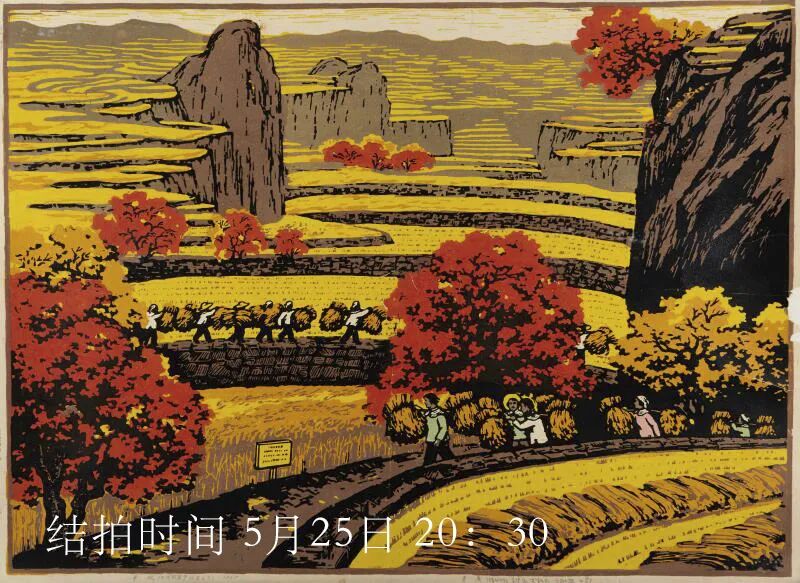 lot305号—lot328号,为文革时期荣宝斋、朵云轩、杨柳青等经典木版水印专场,其中收有荣宝斋木版水印林曦明《太湖新歌》、宋文治《井冈山茅坪八角楼》、单桂英、赵志华《铁索桥畔》、杨列章《韶山》、何香凝、董必武画、郭沫若题词《墨梅》;上海画社木板水印杨之光《矿山新兵》、钱松岩《爱晚亭》、柳村《红柿满枝谷满仓》;杨柳青画社精制木版水印《公社丰收忙》《气象日新》《兄妹开荒》等共二十余件,均为文革时期经典之作。