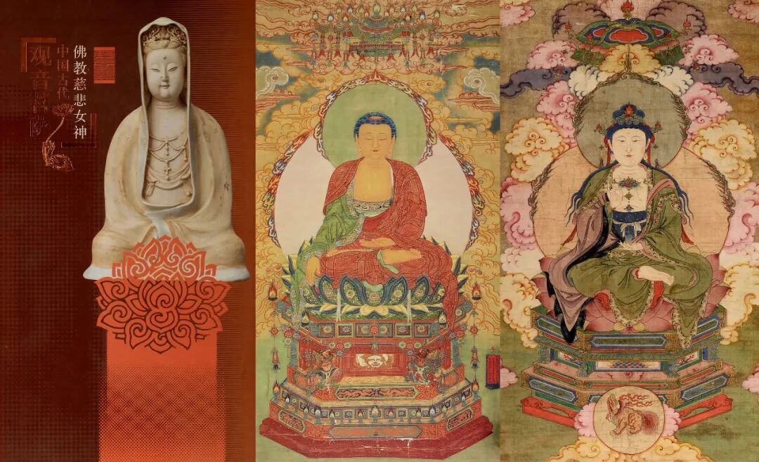 观音菩萨在藏传和汉传佛教绘塑中都有表现,但具体形态有所差别,此幅为汉式风格,所戴宝冠式样独特,宝冠之毗卢五叶为如意云头状,杂饰以繁多的珠花,此种装饰未见于以往的明代水陆画或壁画。不过珠饰的绘制方式是红绿相间,颗颗以晕染加高光的手法展现,立体感很强。冠正前方有线绘小化佛一尊,为阿弥陀佛形象,直身跏趺坐,双手结定印。画面正中的菩萨面容温和,双眉似弓,眼睛细长呈波浪状,鼻准方直,口小唇丰;唇上有髭,颌下有须,为男子容貌,故称男相观音。