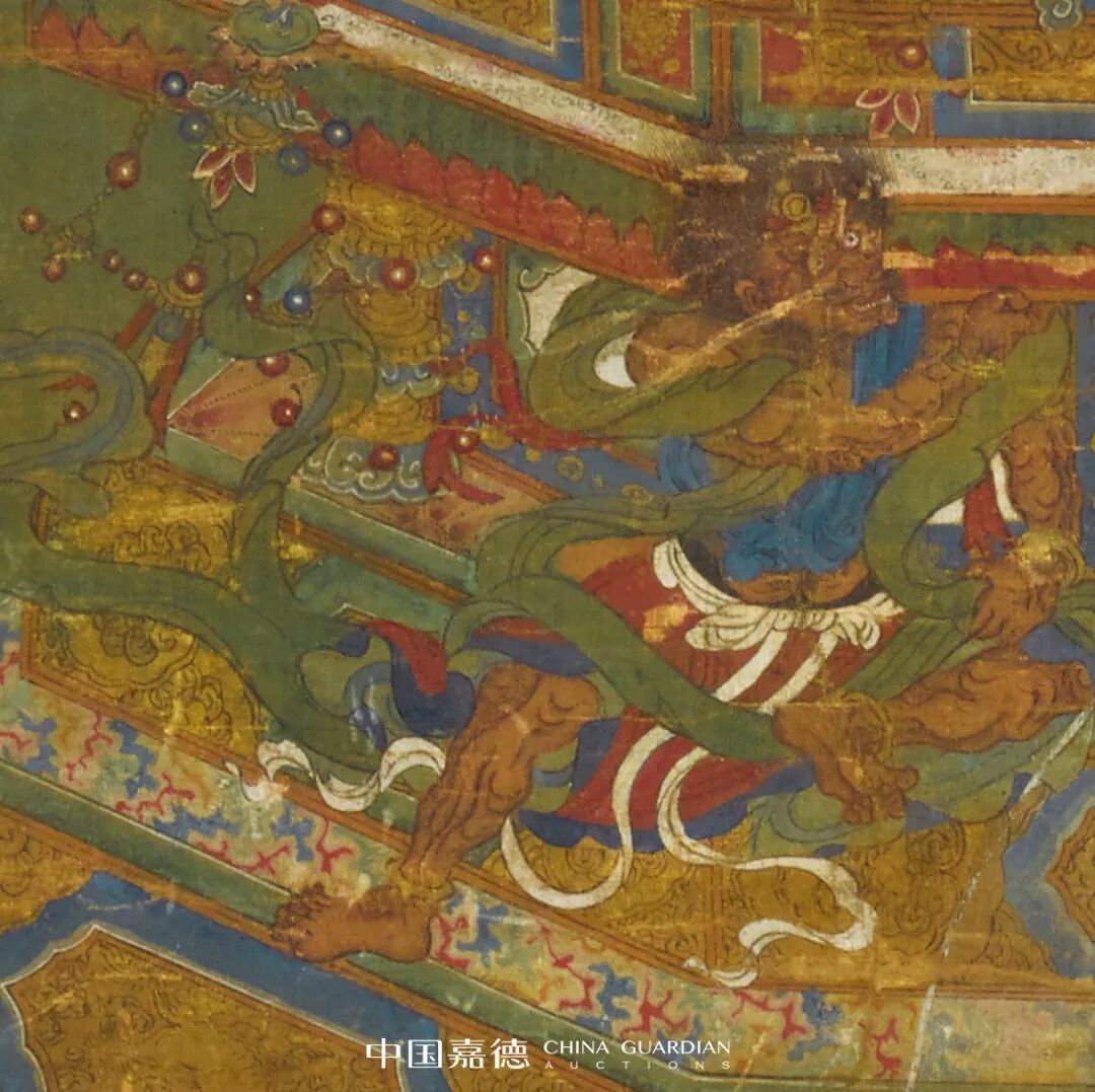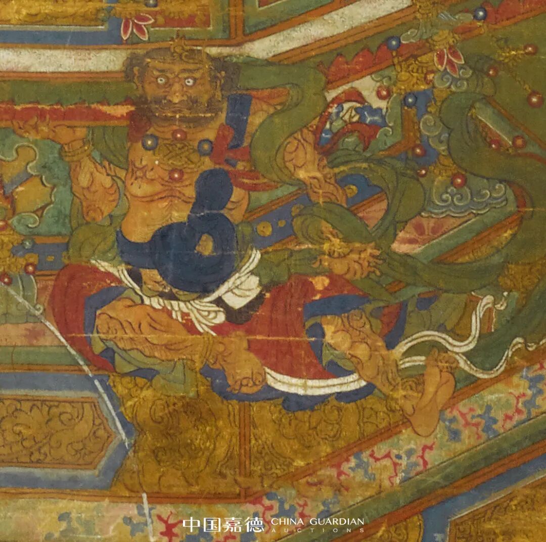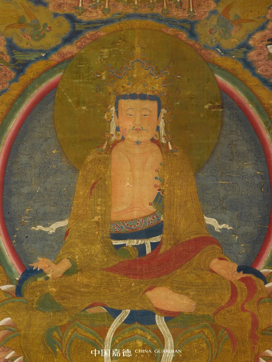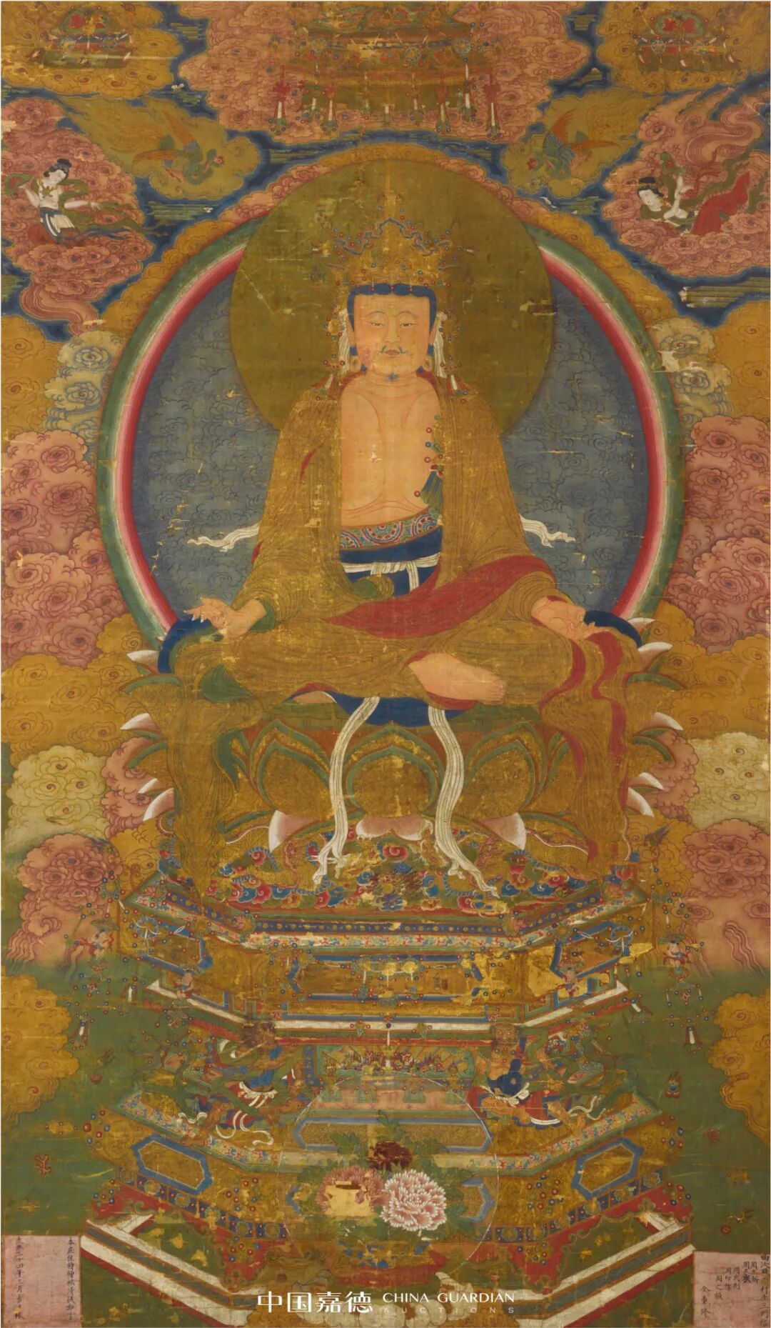 这张精彩的佛像作品应为整堂水陆画中的一幅。水陆画为佛教举办水陆法会时设立道场所用之佛像画。水陆法会全称“法界圣凡水陆普度大斋盛会”,是佛教中最为隆重的经忏活动。水陆法会规模极为宏大,所供水陆画绘像是其核心,极为到重视,但是整堂水陆画内容浩繁,花费巨大,并不是一般寺院所能承受。顶级水陆画的绘制,到底有多昂贵呢?2010年北京翰海秋季拍卖会曾拍出一件万历四年四大天王水陆画,其上有题记写明是郭氏全族“奉银五百”所绘,经台湾艺术大学陈俊吉研究,五百银相当于银锭五十两,而明代一品官员月俸才二十四两,一张水陆画相当于部长级别官员两个多月的薪水,需要全族分担才能绘制供奉,可见其珍贵。