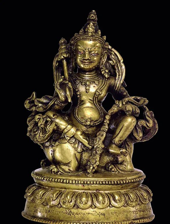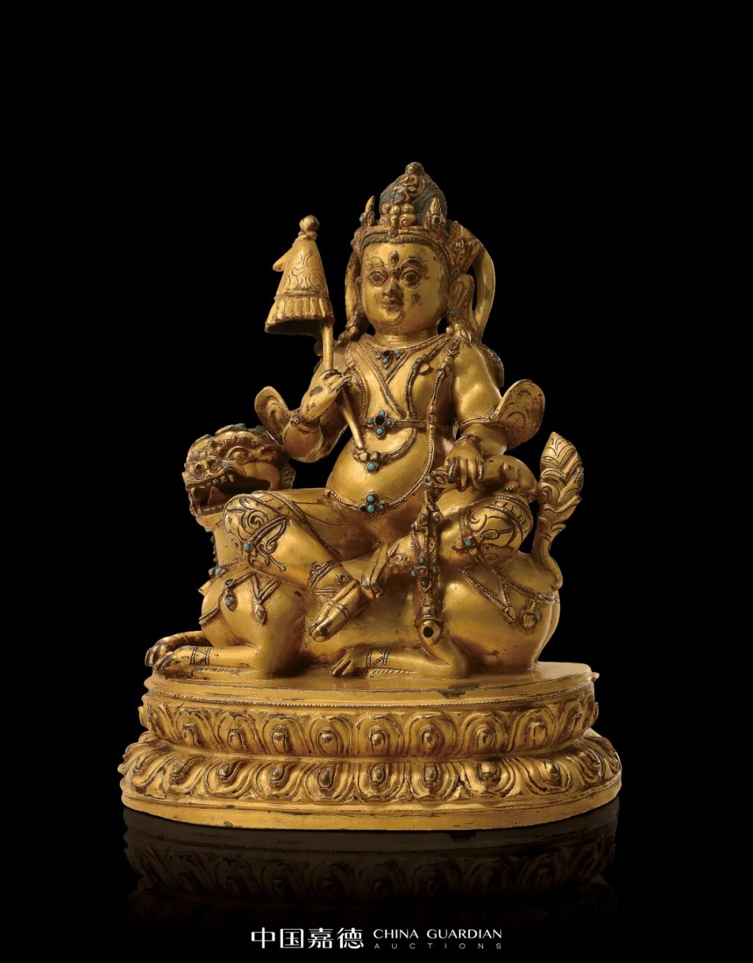 头戴五叶嵌宝石宝冠,头顶发髻前有化佛,发丝清晰可辨。面相圆润,杏核眼大睁,瞪视前方,脚蹬云纹高筒战靴,以威震三界坐姿侧坐于卧狮之上。右手持宝伞,左手握吐宝鼠鼬,口吐连串珠宝,珠串上嵌满宝石,华贵之气尽显。狮子造型结实威猛,胸前肌肉发达,侧首顾盼,大口露齿微张,神态威猛又有趣。下承双层莲座,莲瓣较宽大,瓣芯圆鼓,饱满而又坚挺,光素无纹,尖部向外略微翘起。莲瓣只施正面,背面不施。此尊财宝天王黄铜鎏金,色泽饱满、亮丽浑厚,周身饰品多镶嵌松石为饰。明代的财神、财宝天王造像,传世数量非常有限,流通领域更少见。同样出自15世纪的铜鎏金财宝天王造像,我们可以参考中国国家博物馆馆藏的一尊穿铠甲财宝天王像1;以及喜马拉牙艺术品名录网站(Himalayanarts.org)收录的一尊16世纪未鎏金铜像2,编号90051,与本尊虽风格有异,但难得的同样是未着铠甲、骑狮毗沙门天像。