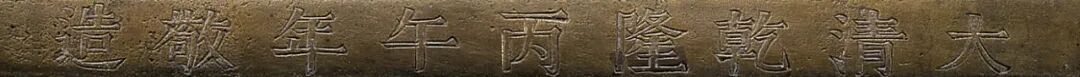 本尊四面各戴骷髅冠,冠顶之发髻为典型清代葫芦型,造型圆润饱满,顶上置摩尼宝,正中前方扎十字金刚杵一枚,左侧帖其标志月牙饰。仔细观察此像之四面,可以发现虽然都是忿怒相,但其实各面表情微有差异,以口齿开阖、鼻翼耸立、眉头褶皱等处的细小差异,表现出由贪入嗔,痴缠忿慢的不同表情,可谓栩栩如生。除宝冠之外,金刚身着七饰:耳环、项圈、四大璎珞、手钏及手镯、脚镯、珍珠络腋与宝带,合为报身八宝饰,而在这件佛像之上,璎珞也有着独特的造型方式,即在常见的人头璎珞和骷髅璎珞之间,雕有金刚杵链一条,这是非常少见的形式。长方形仰覆莲座为双层莲瓣式样,中央高束腰,为典型乾隆中晚期式样。台座前方双圈阴刻九字题款“大清乾隆丙午年敬造”。台座底部盖板精雕细刻十字金刚杵一枚,摩羯鱼吞口为龙头状(见下图),有着皇家风范和气度。