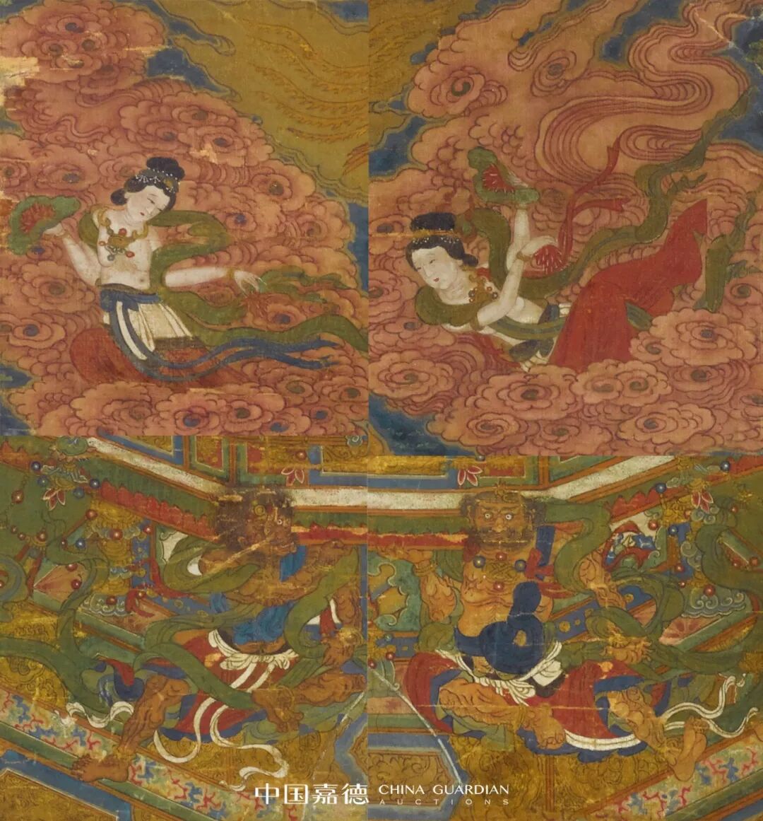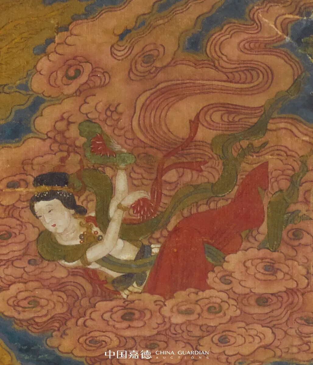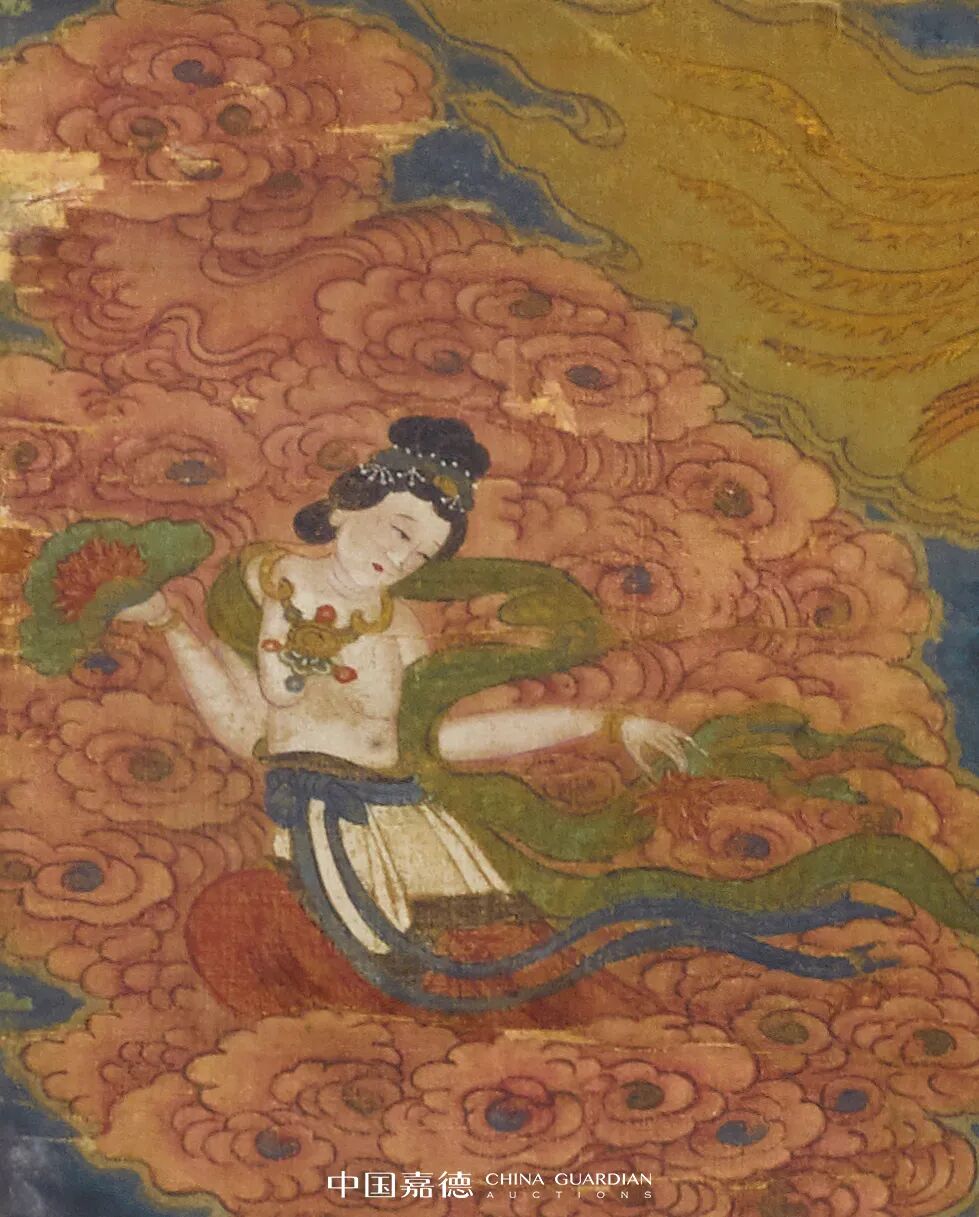 画面上方绘制珠花伞盖,极尽奢华。伞盖两侧各有一天女,身着白色宽袍汉式服装,左侧天女捧香炉,右侧天女手持水瓶,身姿各不相同。