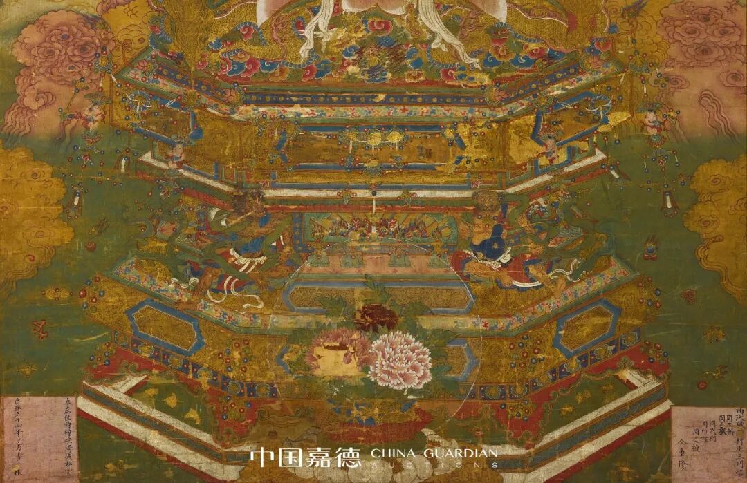 水陆画分为南方水陆和北方水陆,山西是北水陆画的发源地,目前发现的公私收藏的北水陆中,精品画作大多出自山西。除了前述国宝级宝宁寺水陆画以外,可以和此张水陆画比较的还有首都博物馆藏水陆画,首都博物馆藏水陆画有800多幅,其中部分为明代作品,尤其是一些宫廷作品,根据题记显示出自北京附近的寺院,也属于北水陆系统;其中万历三十七年慈圣太后敕造水陆画尤为精美,其上云气和花卉的绘制方法,可以在本次拍品上见到类似的展现。其实国外无论是学术界还是博物馆,很早就对水陆画,尤其是类似此幅的明代敕造性质的水陆画进行了深入的研究,也有不少精品流失海外。如美国佛利尔美术馆藏“五百罗汉渡海图”和美国纽约大都会博物馆藏“莲池观音图”,就是明代内府画的重要标本。