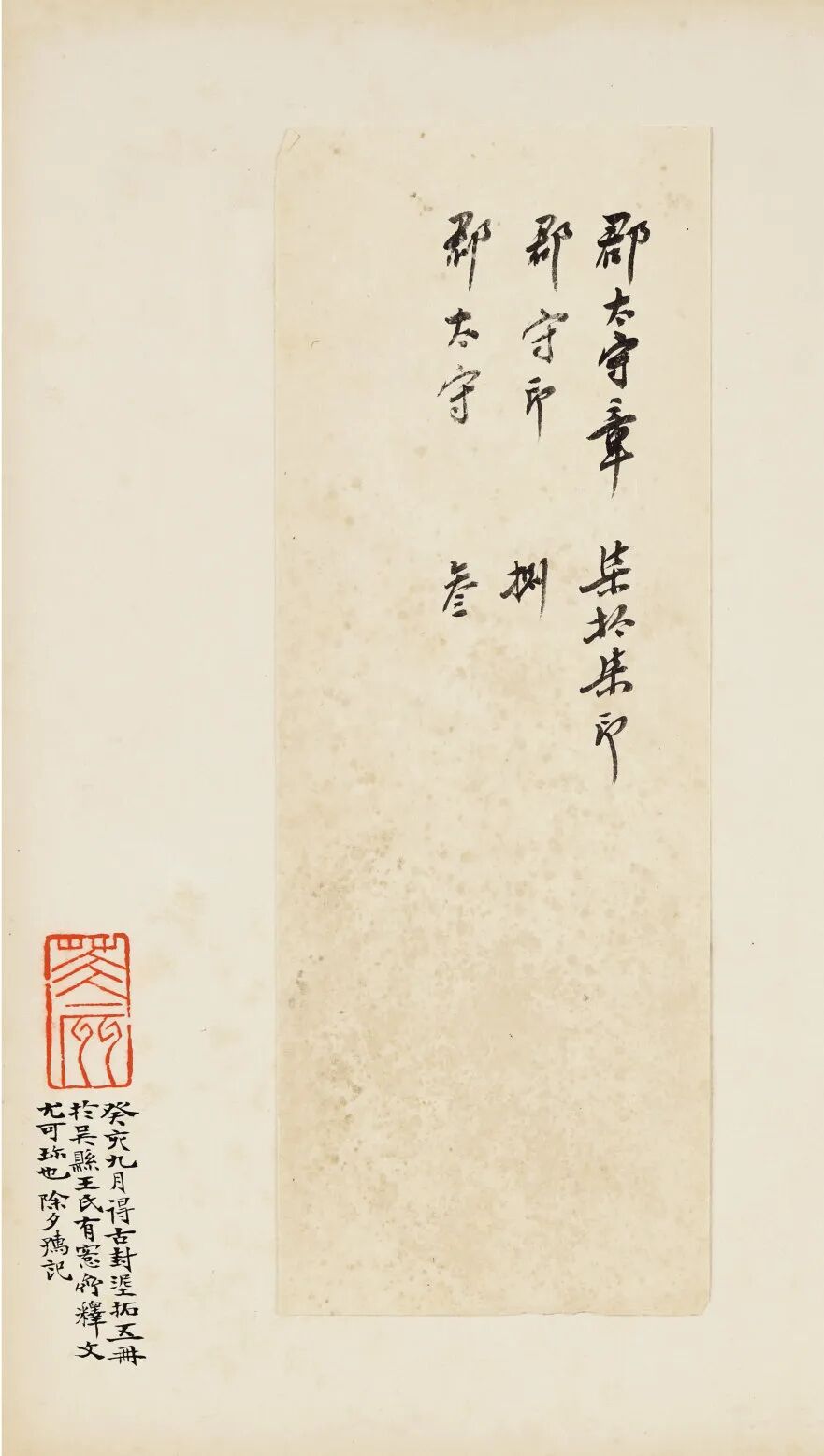 左下角款曰:“癸亥九月,得古封泥拓五册於吴縣王氏。有愙齋釋文,尤可珍也。除夕,孺記。”