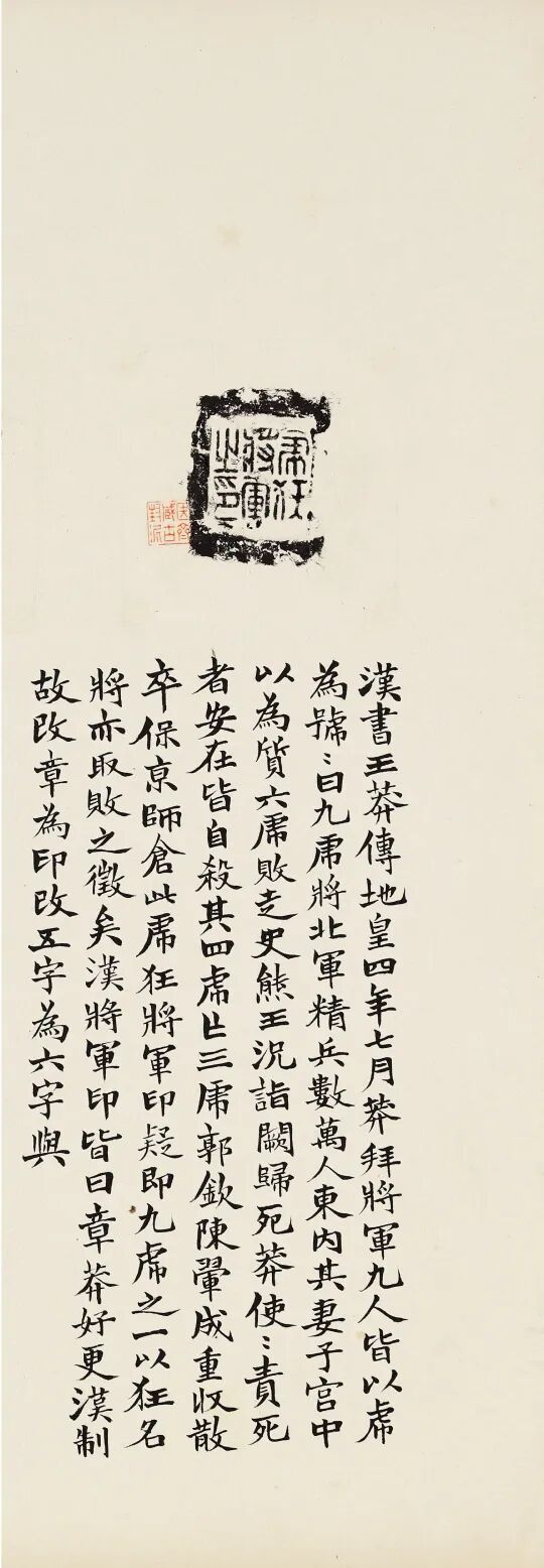当然有时,吴大澂并不完全考证官职本身,还会详细考证这枚印章属于谁。比如此为王莽的九虎上将之一 的印章,除此之外,吴大澂仔细考证了他的生平。