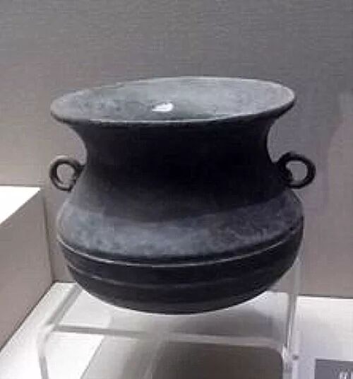 古代炊器,短颈、敞口、深腹、圜底。《广雅》:“鍪,釜也。”釜之有耳者即是鍪。