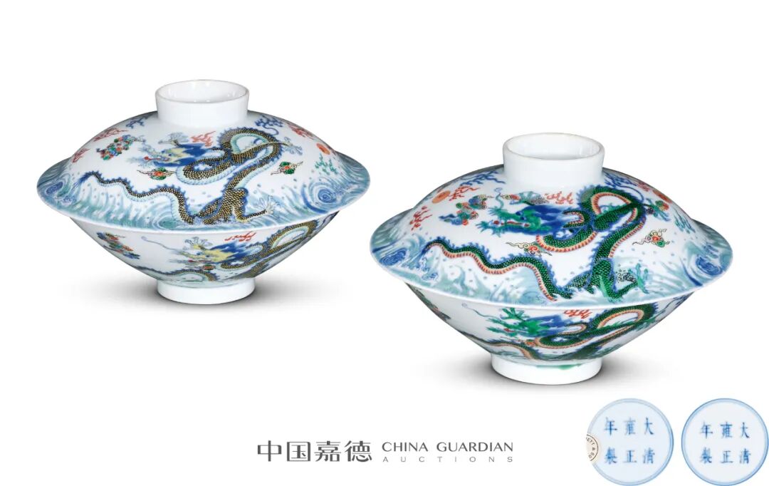 此式斗笠形盖碗仅见雍正一朝有烧造,为雍正斗彩高品级品种。其器形化裁于宣德青花斗笠碗,除若本品绘海水龙纹者,另有绘花蝶者。基于雍正帝超脱的审美和对瓷器烧造的严格把控,本品斗彩设色恰如其分,雅致脱俗。本品还为成对保存,碗底青花双圈内书“大清雍正年制”六字三行楷书款,为标准雍正官窑早期“安窑”款识,其中一只碗心以矾红点绘红蝶,用以遮盖缩釉点,可见窑工的一丝不苟与精巧心思。