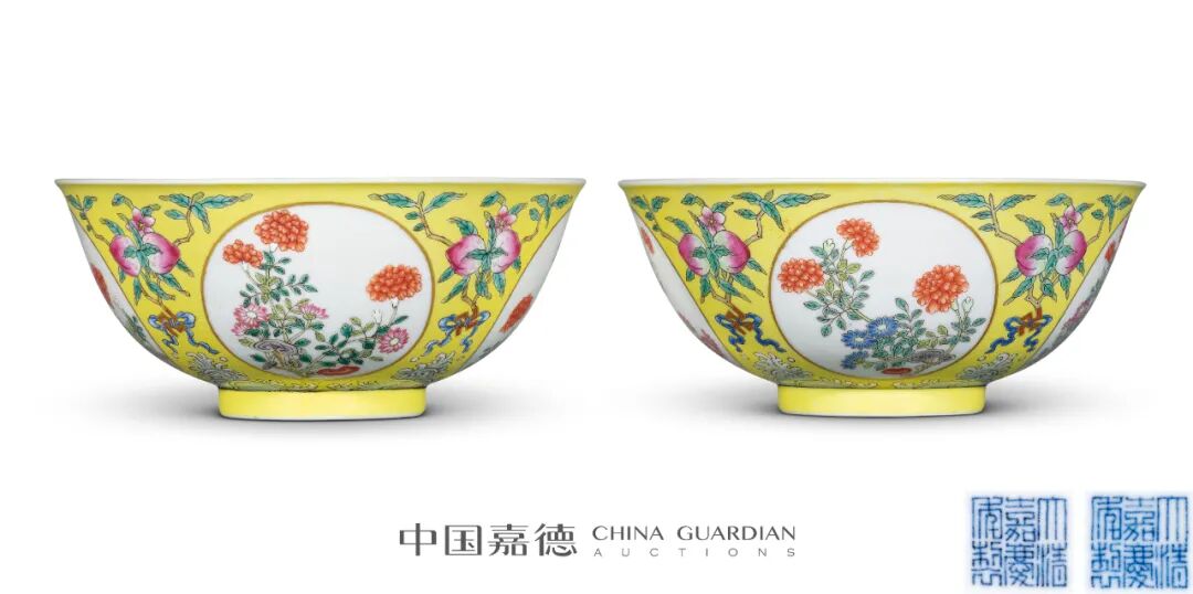 内青花外黄地洋彩开光万寿无疆图碗一对