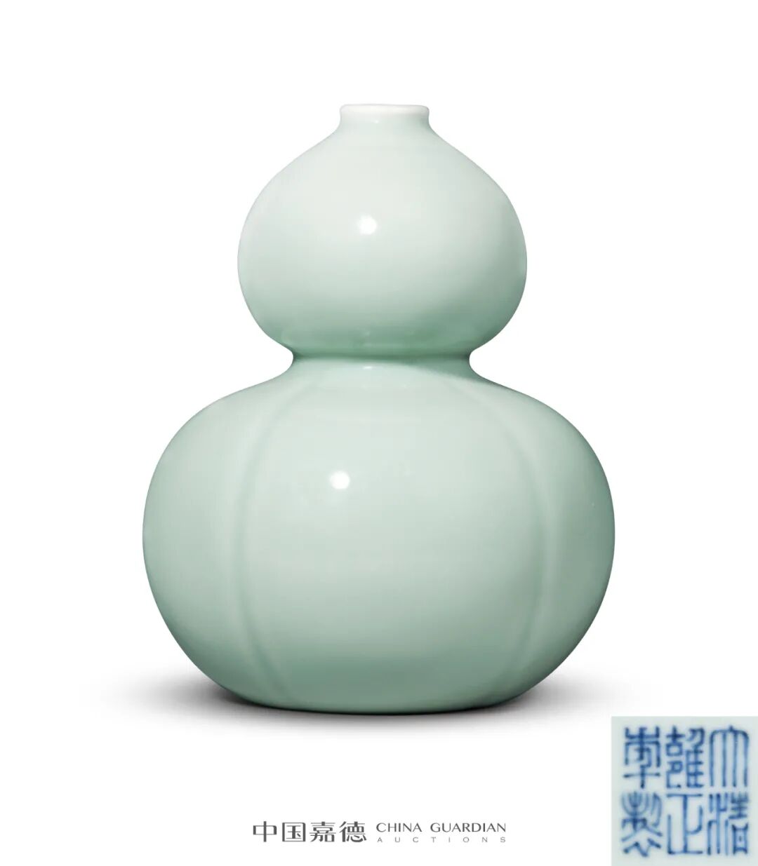 清代葫芦瓶多见尺寸较大、长颈、带有葫芦蒂形盖、无瓜棱装饰之器类,似本品者则甚为少见。雍正帝好古,尤喜宋瓷之雅,曾专命景德镇御窑厂以其为范本,制作各种仿宋瓷品种。唐英在其雍正十三年(1735年)所撰的《陶成纪事碑记》便有称从景德镇东二十里外,地名湘湖,有故宋窑址处,觅得瓦砾,仿其色泽款式,成粉青色宋釉。雍正时,这种粉青釉中除铁外,还含有微量的钴元素,使得成品呈现浅湖绿中透出微蓝的颜色,素雅匀净,文人雅致淡然旨趣跃然。