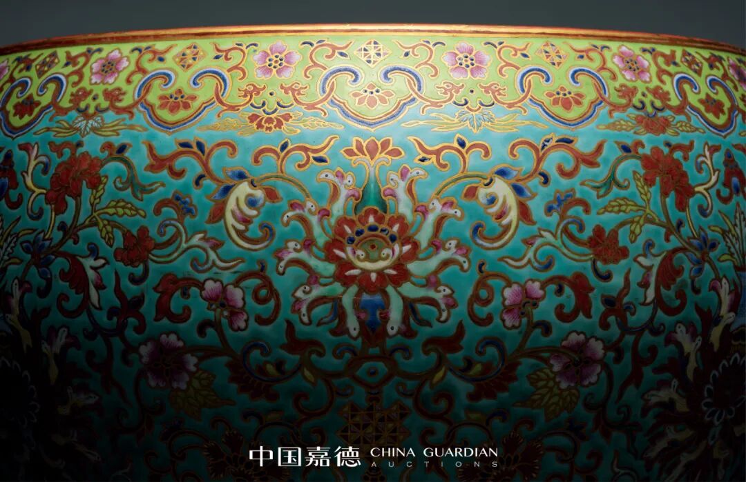 此缸仿铜胎掐丝珐琅器制成,检索公私收藏未见与之完全相同者。缸内满施松石绿釉,外壁亦以绿釉为地,模仿铜胎掐丝珐琅之天蓝色地,其上以洋彩绘掐丝珐琅器代表性纹饰缠枝宝相花纹,花瓣与花蕊色泽浓淡交替,追摹掐丝珐琅器填施彩料厚薄不均之效果。此外,纹饰均以金彩勾边,亦是为仿掐丝珐琅器鎏金掐丝之效果,仿制无不精细。整体纹饰寓意吉祥,配色明艳张扬,乾隆宫廷雍容华贵之气彰显无遗。