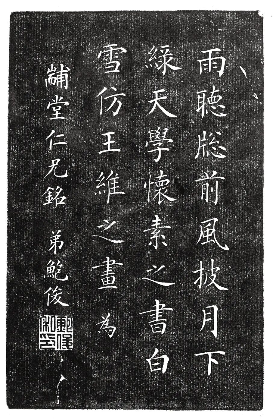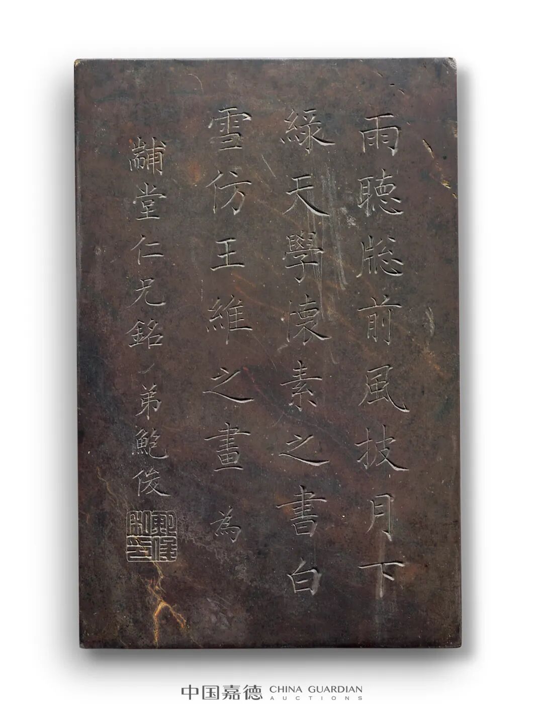 《书林纪事》有载:“怀素居零陵时,贫无纸可书,乃种芭蕉万余株,以蕉叶供挥洒, 名其庵曰‘绿天’。书不足,乃漆一盘书之,又漆一方板,书之再三,盘板皆穿。”由此可知铭文中“绿天”当指蕉叶,用之此处不知是否代指石品“蕉叶白”。其后“白雪仿王维之画”所言,当赞王维擅绘雪景,其更是“雪中芭蕉”的记载。宋人沈括(1031-1095)在《梦溪笔谈》中有言:“如彦远《画评》言:王维画物,多不问四时,如画花往往以桃、杏、芙蓉、莲花同画一景。余家所藏摩诘(即王维)画《袁安卧雪图》,有雪中芭蕉,此乃得心应手,意到便成,故造理入神,迥得天意,此难可与俗人论也。”此处先谈“绿天”,后叙“白雪”,所造“绿天白雪”之情景,则恰若王维之“雪中芭蕉”,似喻砚之石品,更深层或是“得心应手,意到便成”的超然意境,放诸万物皆可体悟。
