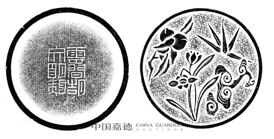 “杨雪渔铭并题 蜇虹云月砚”,以端溪老坑石为材,色呈青紫,石材尤佳,具鱼脑冻、青花、火捺及一高眼,眼称胭脂眼,晕至五层。砚呈长方,制为板式,砚背右侧杨文莹自镌铭文。此砚著录于《幸草亭砚谱》下册,无页码。《幸草亭砚谱》为杨雪渔集拓而成,无序跋介绍辑拓过程,亦无页码,即本场拍品第3155号:“《幸草亭砚谱》”。《幸草亭砚谱》,“杨雪渔铭并题蜇虹云月砚”