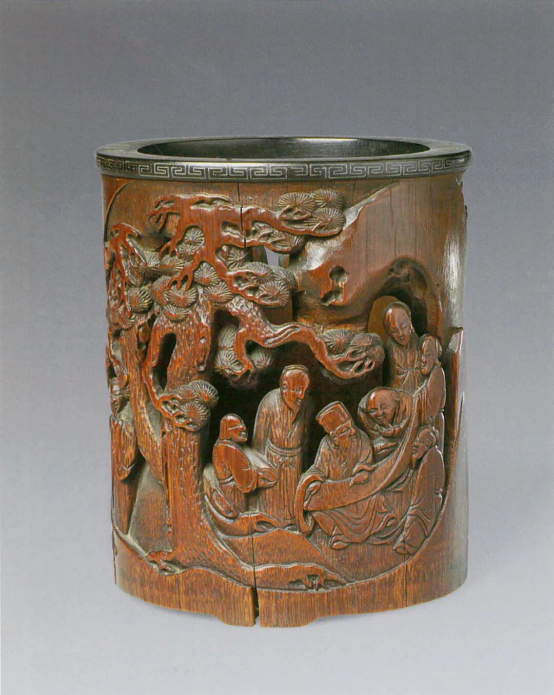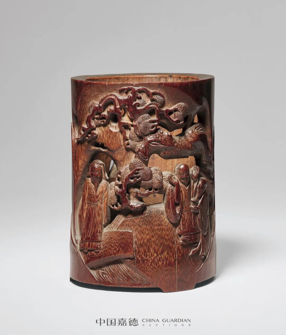 “虎谿三笑图 透雕法古竹笔筒”,以古竹为材,包浆醇厚,色呈朱红。以透雕法镌之,风格上相类晚明嘉定朱门三松,山石间苍松横生,苍虬之下,三位高士相对而立,画面左侧儒生装扮者当为陶渊明,与其相对二人,一僧人装扮举掌大笑,是为慧远。身旁侧立者,三清装扮者即陆修静。