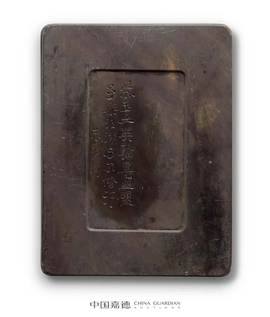 “朱为弼铭 紫玉端砚”,以端溪石为材,色呈青紫,具青花、火捺、金线等石品。砚呈长方,正面周起浅缘,内置淌池式,砚背浅琢覆手。于覆手左侧镌铭,是砚著录于邹安撰,《广仓砚录》下册(广仓学宭,民国珂罗版,东京 :东京堂,1981年翻印),无页码。