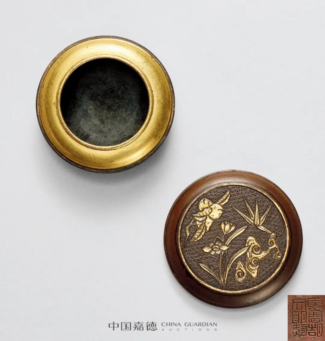 “胡文明制 山中仙友图鎏金错银香盒”,圆形盒,盒口内敛,盖面饰圆形开光,其内饰龟背锦地,其上浅浮雕山中仙友图,一枝竹叶、双头寿桃、一株灵芝、一丛水仙,均是山中清雅仙卉,又承竹寿灵仙之意。盒、盖口沿饰错金回纹。敛口、浮雕纹饰处鎏金,金铜二色错落有致。外底心阴刻“云间胡文明制”六字双行篆书款,属胡氏较典型的属款方式。![]()