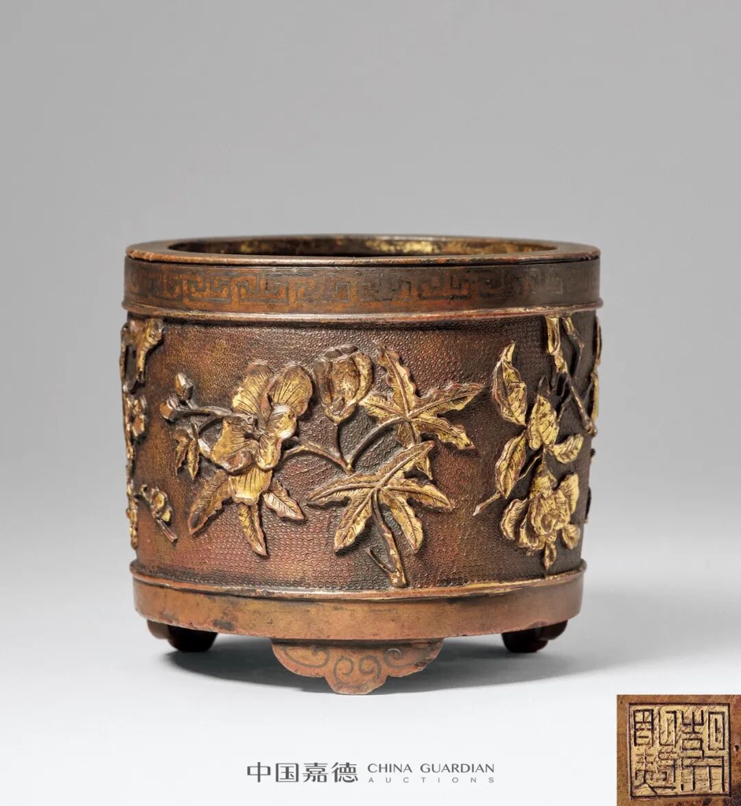 胡氏风格作品,除偶有所见胡文明亲作外,仅零星可知有其子胡光宇承父业所制,如上海博物馆藏“胡文明男光宇制 鎏金刻花三足炉”,即为一例,其造型与本品大体相类,所饰亦为四季花卉,唯选卉有别,可从中体悟胡氏父子铸技之传承。胡光宇的生卒未见于文献记载,亦有人猜测其早逝,或未能将胡氏铸技留传。而胡文明既有“不传他姓”之誓,其精湛的铸炉技艺也就成为独一无二之绝技。![]()