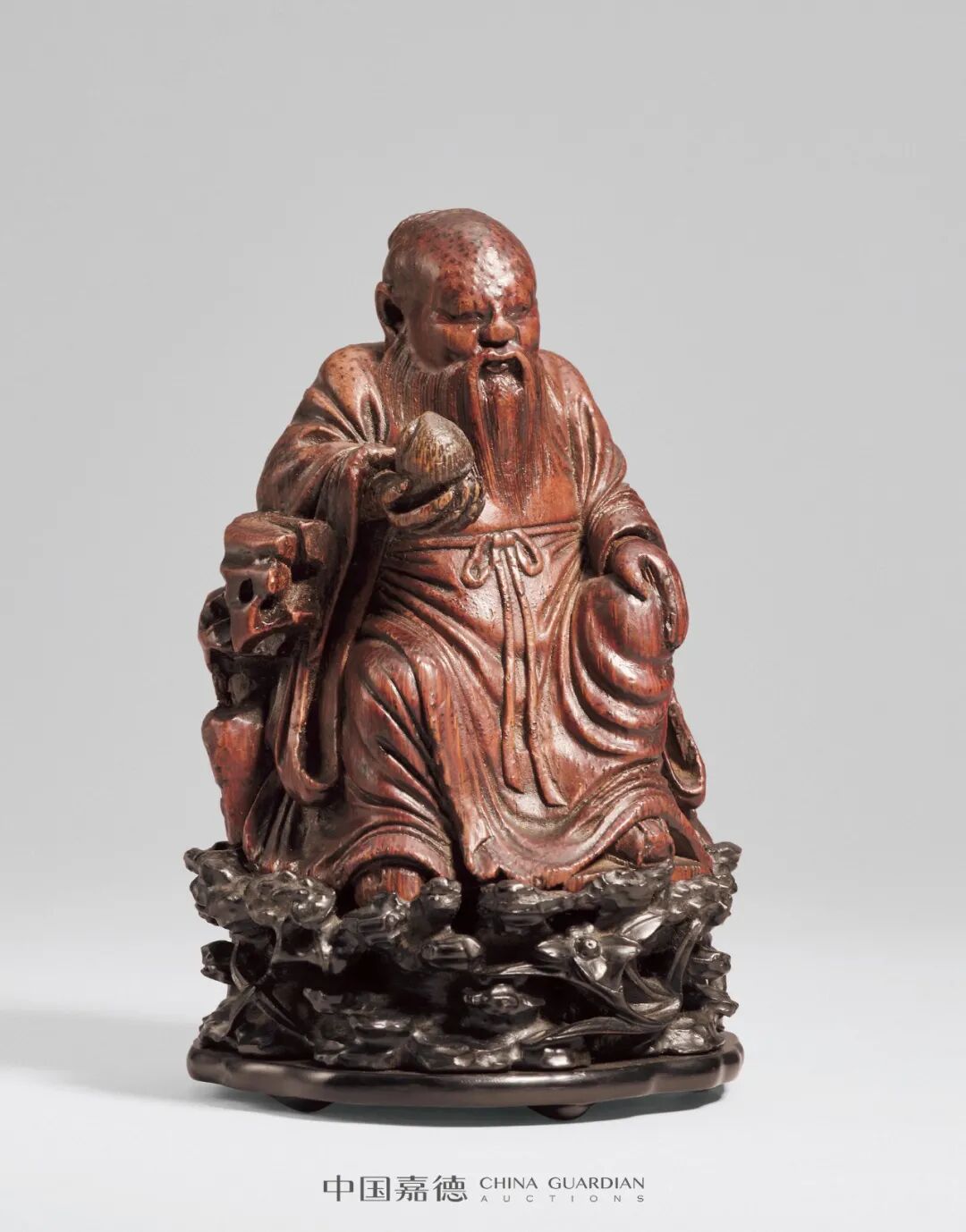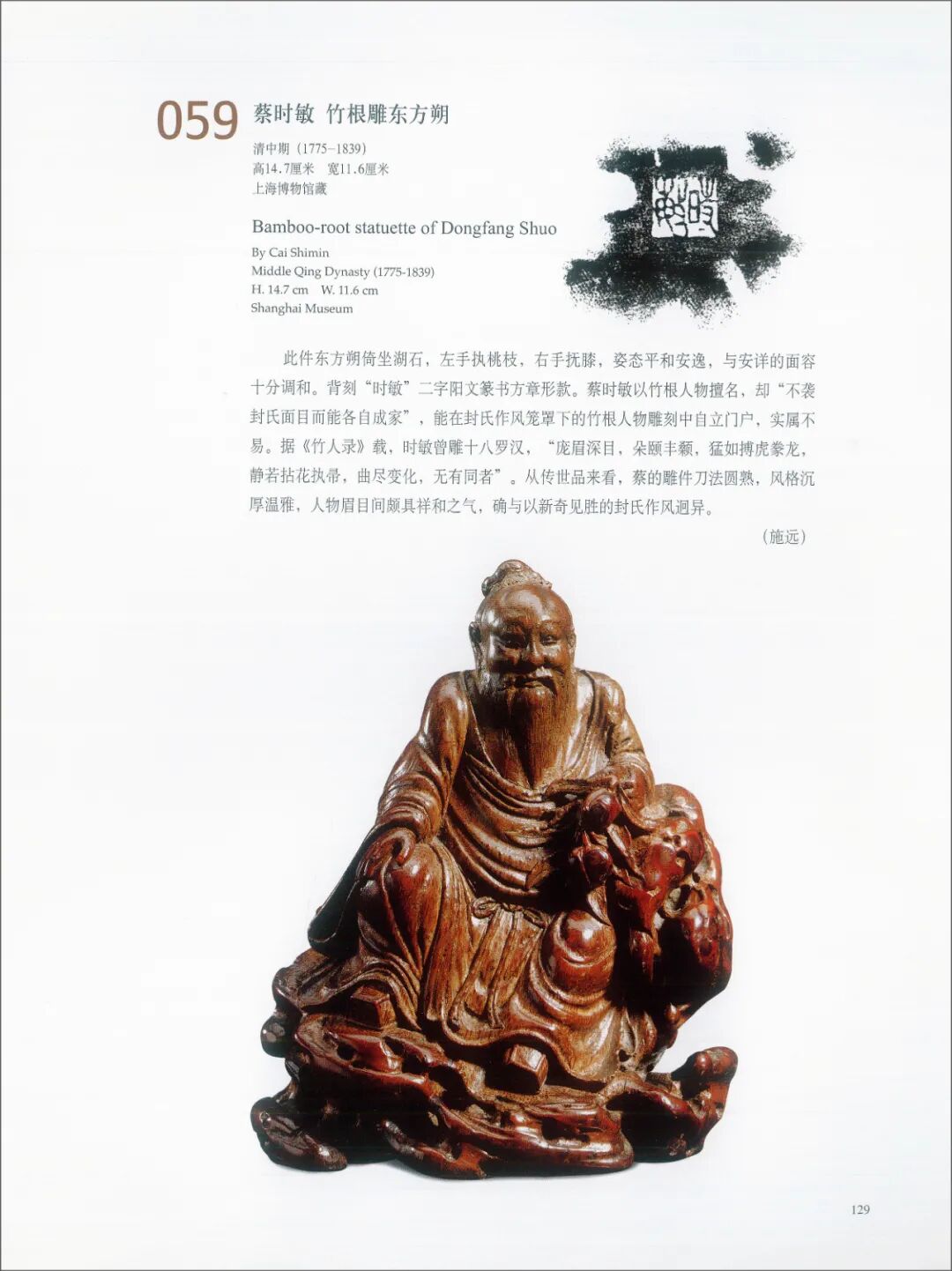“蔡时敏风格 东方朔竹艁像”,竹根圆雕,东方曼倩端坐石座之上,面容宁谧,左手扶膝,右手持桃,风格沉厚温雅,眉目间具祥和之气,与新奇见长的封门竹雕风格迥异,属于比较典型的蔡时敏风格。清金元钰撰《竹人录》中记载:“时敏,字逊初,小字肖官,遂以蔡肖官得名。雕镂工巧,最善人物,不袭封氏面目,而能各自成家。尝摹李龙眠十八尊者,庞眉深目,朵颐丰颡,猛如搏虎豢龙,静若拈花执帚,曲尽变化,无有同者。惜年不永,卒四十九岁。”上海博物馆藏“蔡时敏竹根雕东方朔”