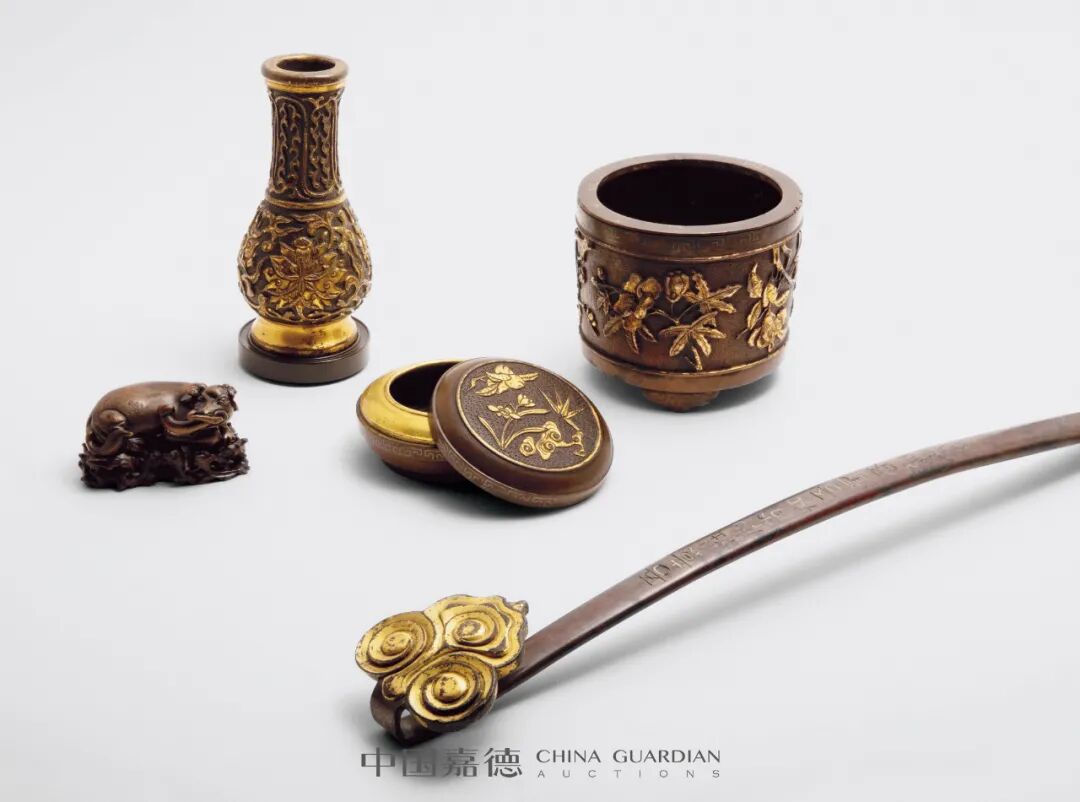 铜器部分由文镇、笔架、水丞、如意等案头小品及铜炉、暖炉、香盒、箸瓶等香器组成,其中胡氏文明制器四事,尤为精绝,择其二以飨。Lot 3199