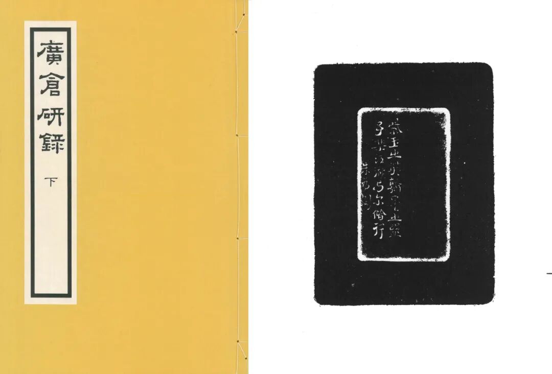 《广仓砚录》,邹安所撰,是书分上、下两册,所收录作品均为唐宋至明清历代名砚数百方,其中不乏砚中佼佼者,如唐开元二年雷霄断“石上枯”砚、清贻晋斋珍藏“西堂著书之玉带”砚等。后附有臂搁、茗壶、笔筒等拓本。上海博物馆即藏有《广仓砚录》著录者,如“袁枚铭 竹节形绿端砚”