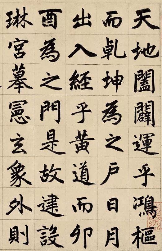 赵孟頫《三门记》与《胆巴碑》如出一辙,但更加简练成熟。《三门记》既不同于魏晋小楷的俊逸,更不同于唐楷的森严。单字来看,线线之间的顾盼承接,空间与空间的虚实对比,无不包含着一种内在的力量和如涓涓细流永无休止之势,是赵楷中的典范。