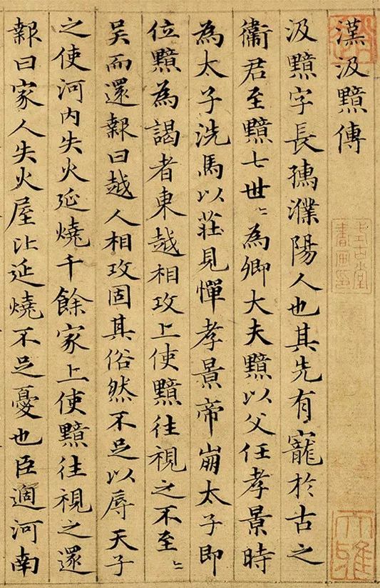 《汲黯传》被誉为赵孟頫小楷第一。落笔迅捷、从容不迫,一气呵成,而无一笔失度;其字体宽和雍容,风骨秀逸,平和简静,有轻裘带之风,极富有节奏感。在结体上,法度严谨,挺秀润健,顾盼揖让得体,寓丽开阔,秀美而苍劲。