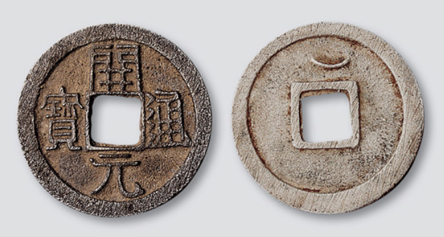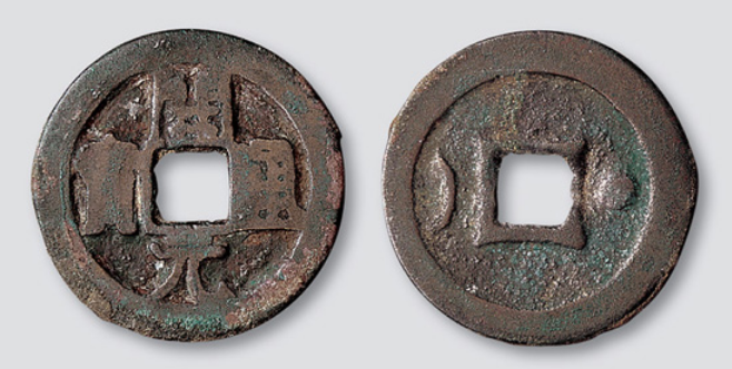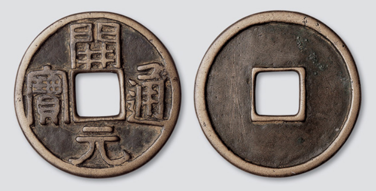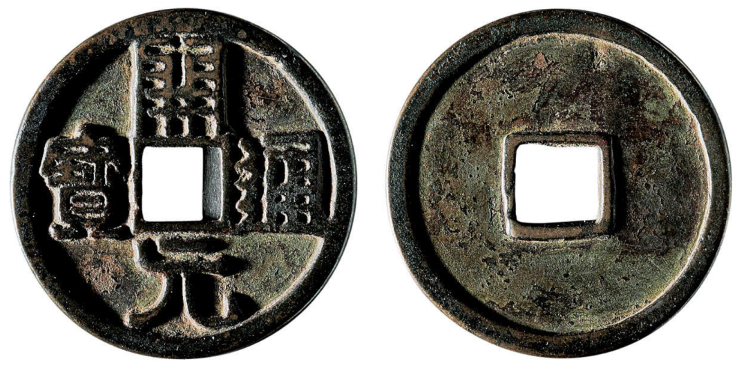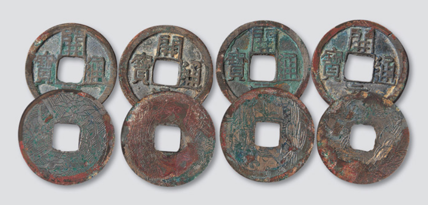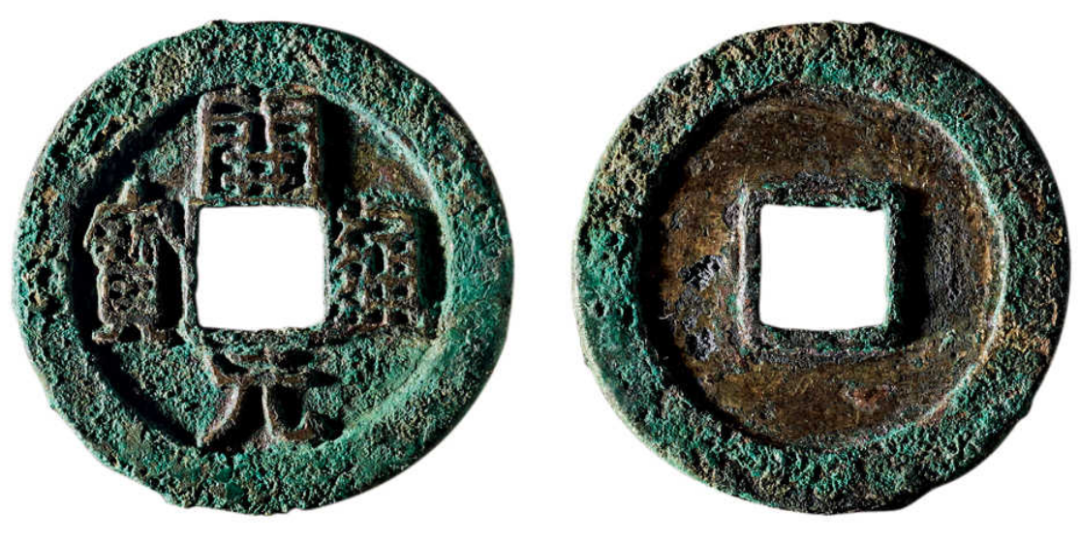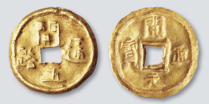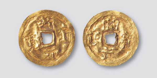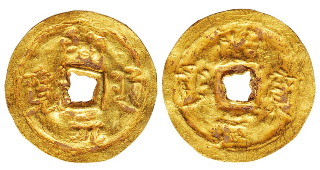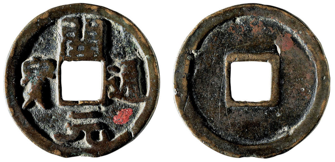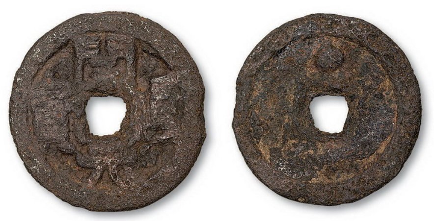 RMB20,000-30,000(成交价22400)五代十国时期闽开元通宝背上巨星铁钱(直径43mm),较少见,美品开元通宝金质小平,直径24.5mm,极少见,极美品唐代开元通宝背佛教人物、花草一组四枚,钱背镀银线刻佛教本生、吉祥花卉,应为唐代供养钱,极为罕见,美品唐代“开通五路”、“开元通宝”金钱各一枚,少见,合重3.9g,美品开元通宝背龙凤高浮雕图案花钱,直径35.5mm,少见,极美品