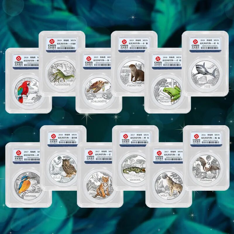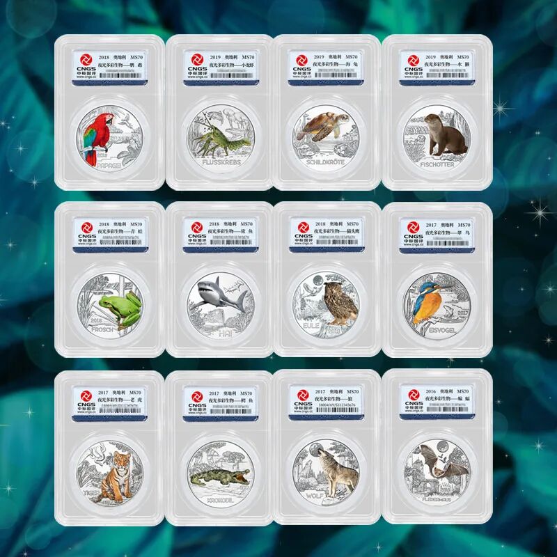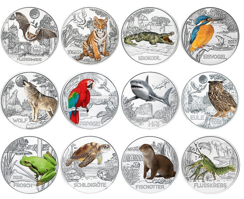 这套由奥地利发行的多彩生物纪念币,自2016年10月开始至今,一共发行了12枚。陆续展现了蝙蝠、老虎、鳄鱼、翠鸟、狼、鹦鹉、鲨鱼、猫头鹰、青蛙、海龟、水獭、小龙虾等常见的多彩生物。