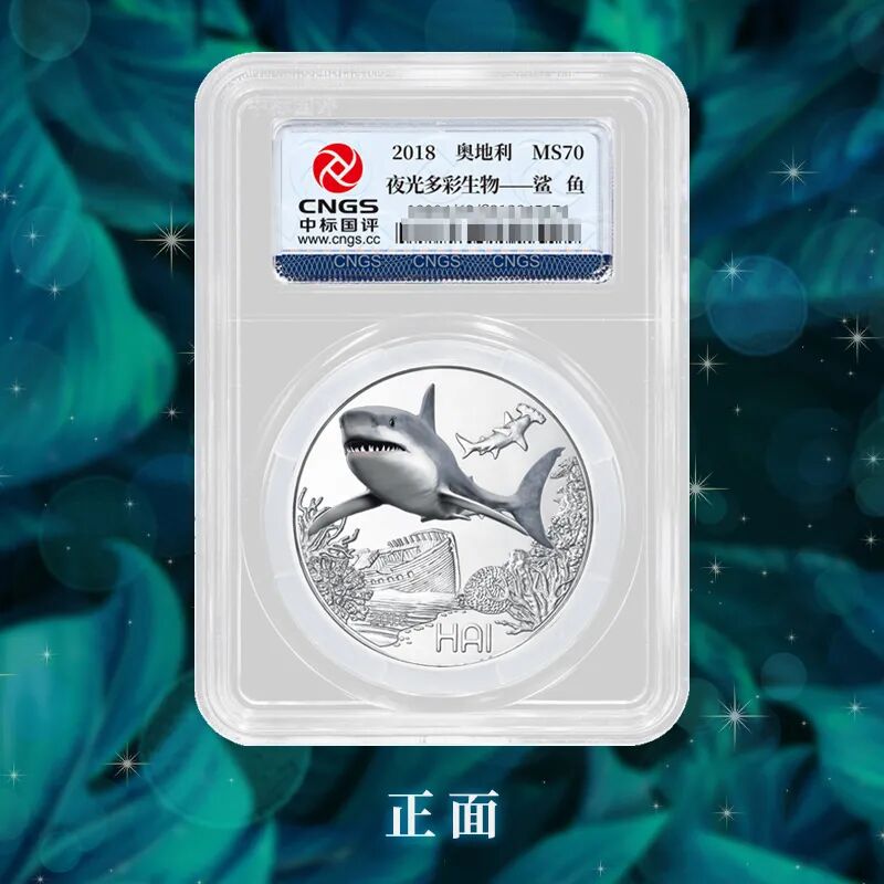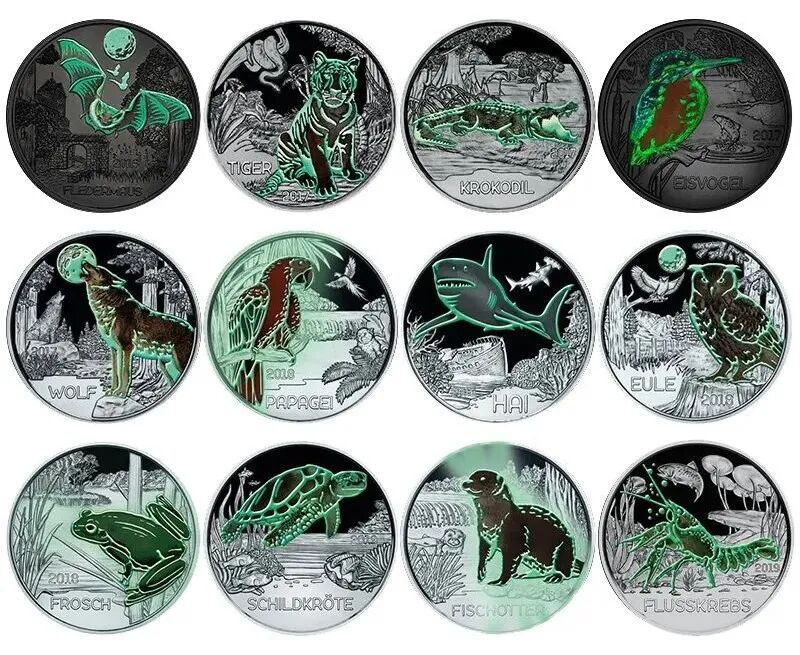 这套币最有意思的地方,在于它是夜光币,只需要在阳光下晒过,就能“触发新技能”,在夜晚环境下,夜光线条勾勒出币上多彩生物的本体形象,发出幽幽绿光,设计十分精细,又有趣,又好玩~
