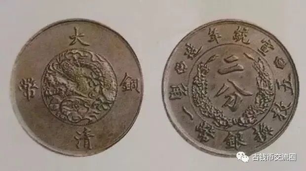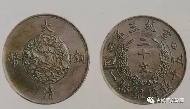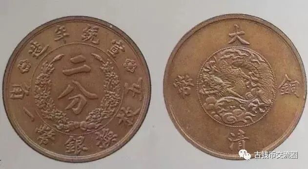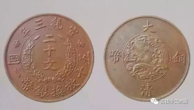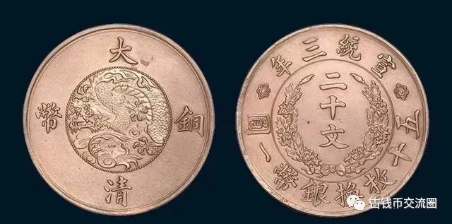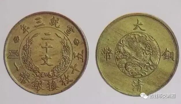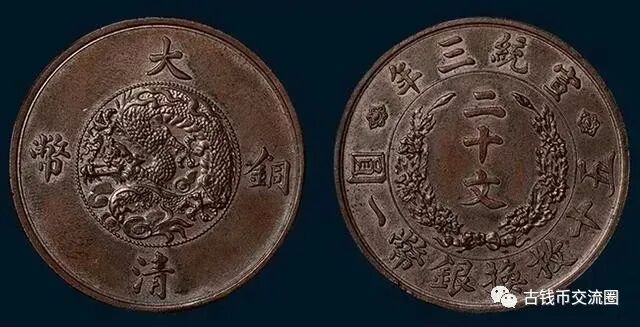 二十文也是没有正式流通过的钱币,极其少见,等级为三级。还有白铜质和合金材质的更是国宝级,为仅见。二十文比五文和十文钱体都要大一些,正面和五文图案一样,反面面值标记为二十文,五十枚换银币一元。珍辈出的宣统三年大清铜币&宣三六个稀少品种,未使用品,2009年中国嘉德拍卖成交价184800元,这个价现在连一枚一厘都买不了,不得不说当年拍到这六枚币的人是幸福的,也是让人羡慕的。