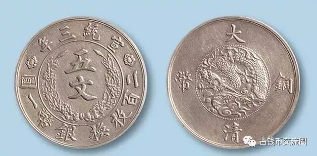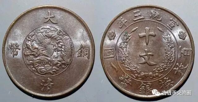 五文未正式流通发行,所以是非常少见的,等级为四级钱币。铜币正面中心为龙的图案被小珠圈环绕,龙上下左右分别为“大清铜币”四个汉字;反面中心为麦穗图案,中间的“五文”二字直读,圆形上方钤“宣统三年”四个汉字,两侧分别有花瓣图案,圆形下方钤“二百枚换银币一元”八个汉字。宣统三年大清铜币十文