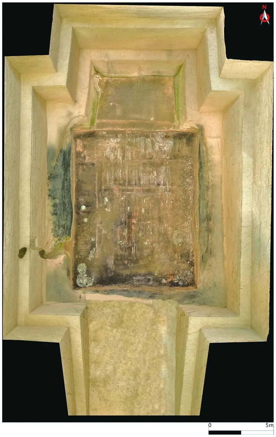 秦陵陵西墓葬墓室正射影像图考古人员将回廊外分为东西南北四个边箱,陪葬品主要集中在东、西、南三侧的边箱中,西侧曾遭到盗扰。出土陪葬品有陶器、青铜礼器等。青铜礼器包括鼎、豆、壶、编钟等高等级陪葬品,部分带有铭文。以及单体金银骆驼、舞袖俑、金银玉器等诸多精美文物。秦始皇帝陵博物院研究员蒋文孝:“东部这一块区域呢,有编钟一组15件,金带钩两件,带钩上面有文字标识它的重量。在南侧东部区域分布有大量小型的器物和半两(钱币),半两是分布有好几千枚。发现了几个铜构件,上面有‘乐府’字样。”在发掘过程中,考古工作者也采用了先进技术,提取至实验室考古以及进行保护修复等。本次发掘明确了墓葬选址及布局,墓葬采用壕沟和自然河流合围,形成了相对独立的墓园。墓葬具有一定规律性,时代大体相当,应是经过人为规划有意布置而成,属于国家行为。