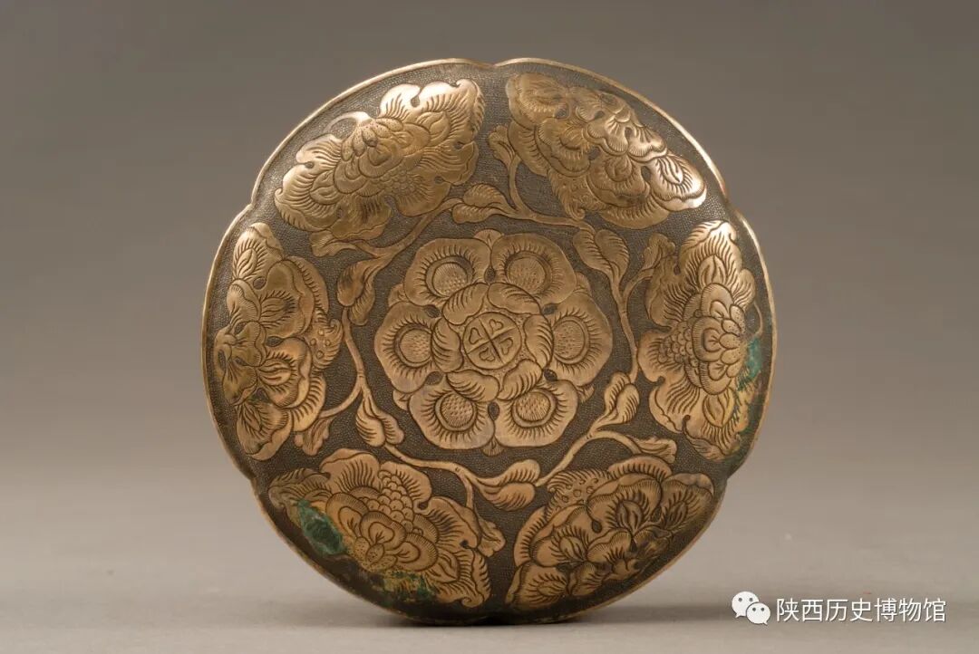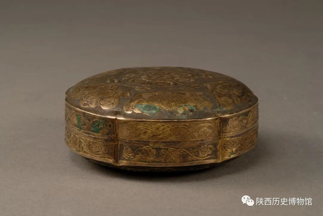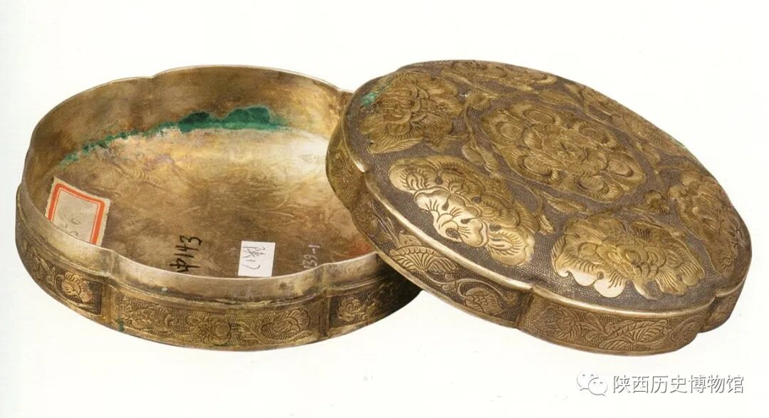 鎏金宝相花纹银盒:盖面与盖底图案相同,中心部位安排宝相花,外绕六朵阔叶折枝花,并由此形成六曲形盒体,“徽章式”圆框已由环绕的缠枝代替,整体效果舒展、大方。类似的还有1件鎏金宝相花纹银盒,只是规格稍小,且纹样亦稍有差异。六曲花瓣形银盒的出现,标志着唐式盒的形成。