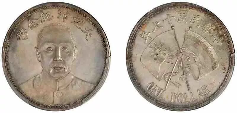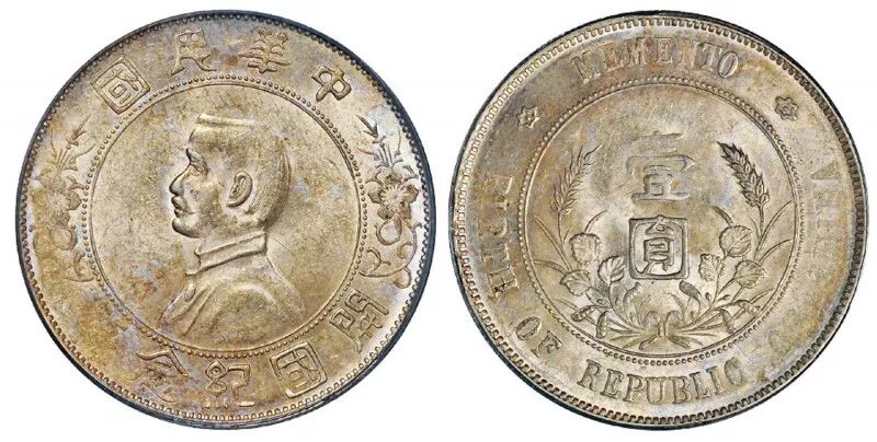 中华民国孙像开国纪念币银元,正面中央为孙中山侧面肖像,边缘内上镌中文隶书体“中华民国”、下镌“开国纪念币”、左右长枝花饰。背面中央为中文隶书体“壹圆”及嘉禾,边缘英文“中华民国”、“壹圆”,左右分列五角星(后改为六角星)。