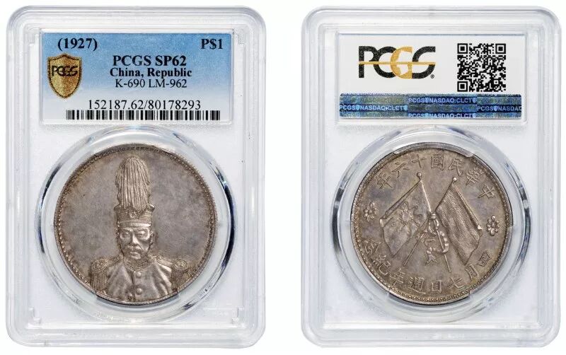 ▲民国十六年褚玉璞像背双旗周年纪念银币/PCGS SP62,2016诚轩秋拍以690,000元成交