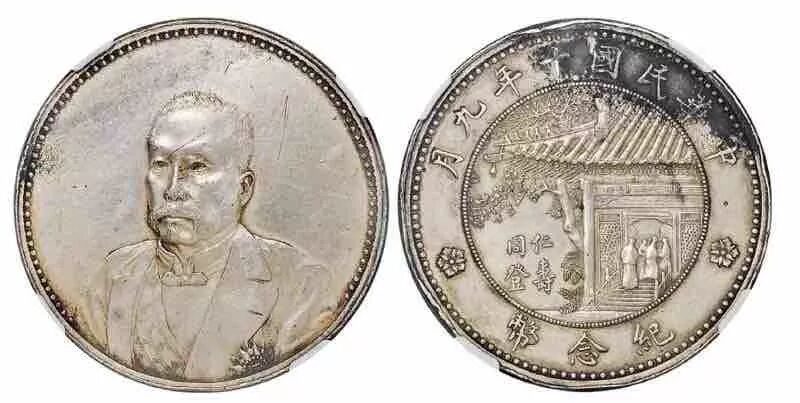 民国七年十月,徐世昌当选中华民国大总统,民国十年九月,适逢徐世昌67岁寿辰并当政三周年纪念(取名“仁寿同登”),天津造币厂特开铸此币,该币有两种版别:有“纪念币”字版,无“纪念币”字版。