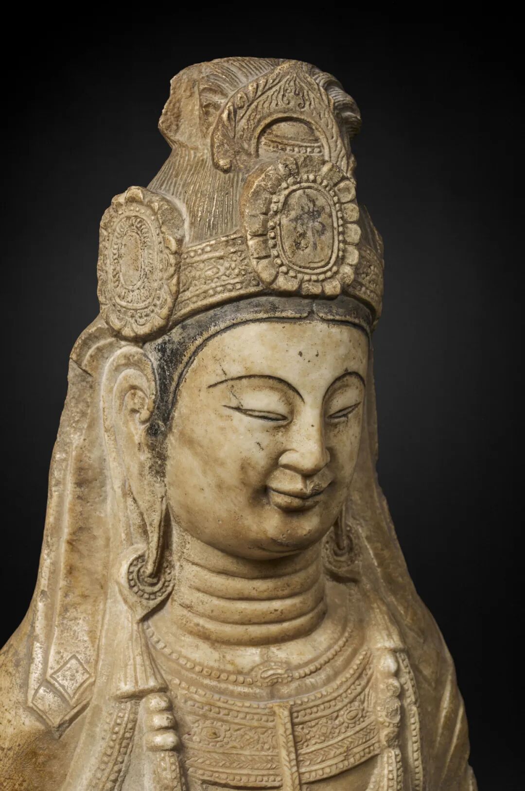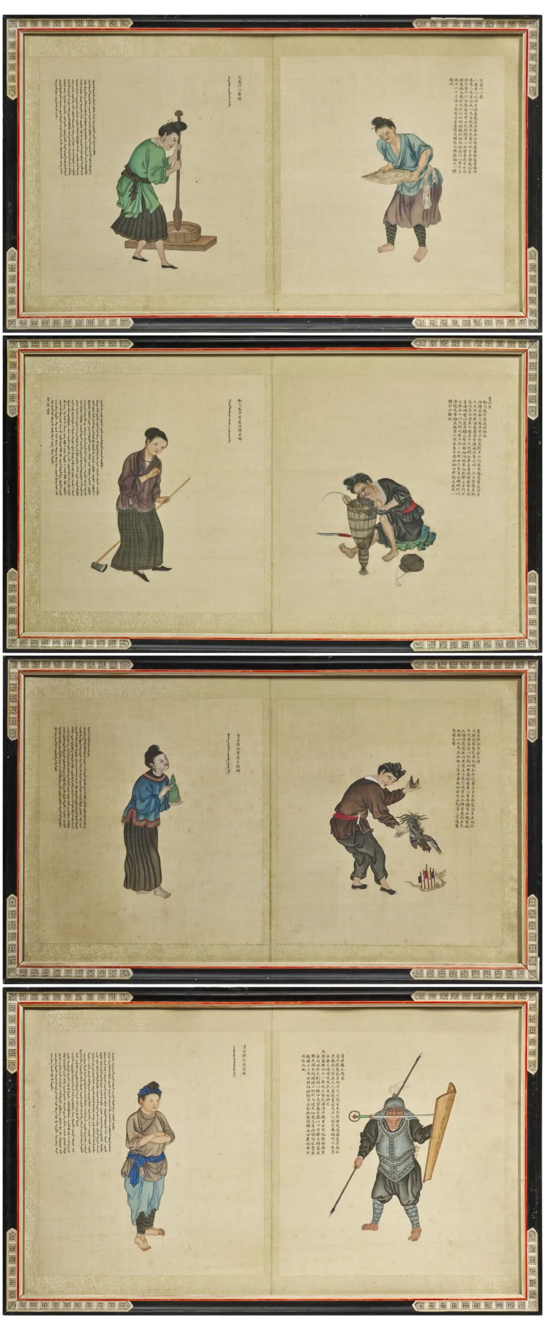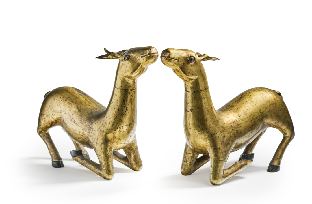 本系列藏品的核心是一件博物馆馆藏级的白色大理石雕塑,从19世纪末以来经历了巴黎L先生三代人的传承。带有米黄色的包浆,雕刻的是观世音菩萨,其名意为"感知世界的声音",通常称为观音。本尊观世音菩萨外形呈女性形态,为隋朝时期所造,此时佛教经过在亚洲的漫长旅程后传入中国,这尊白色大理石雕塑,正是佛教在中国达到顶峰时的一极佳证明,是本次拍卖的一大亮点。《皇清职贡图》,清代记述海外诸国及国内各民族的史籍。乾隆十六年(1751)至二十二年完成七卷﹐二十八年续成一卷﹐合卷首共九卷,清傅恒、董诰等纂,门庆安等绘。总共绘制三百种不同的民族与地区之人物图像,每一种图像皆描绘男、女二幅,共计约六百幅。每幅图绘之后,皆附有文字说明,文词浅显易懂,简要地介绍此民族与清王朝的关系,以及当地的风土民情。本次上拍的《职贡图》第八卷,描绘的是贵州省苗族的风土人情,每组两幅。注释:西藏18-19世纪鎏金铜鹿一对,铜压锤揲工艺。小鹿呈跪姿,头直立仰望;眼睛、耳朵、嘴巴、蹄子和尾巴下端用红色和黑色染料强调;腹部有一空腔,可以收纳经文。