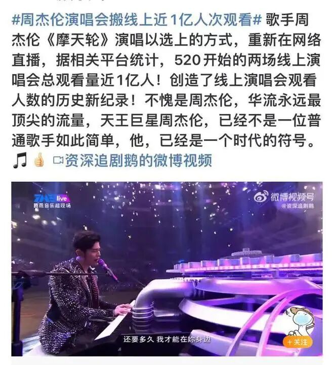 5月20日、21日连续两晚,周杰伦的地表最强、魔天伦两场演唱会在QQ音乐、视频号等平台重映。据相关平台统计,这两场线上演唱会总观看量近1亿。
