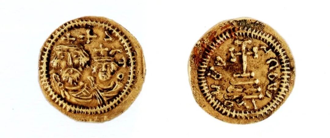 何家村遗宝中有一枚东罗马金币,金币正面为头戴十字冠、肩披甲袍的国王,一般认为大者为希拉克略,小者为其子,背面为十字架和四级台座,两侧是铭文。弗拉维斯·希拉克略(FlaviusHeraclius)本为非洲省省长,属地方显贵,公元610年登上皇位,建立希拉克略王朝(610-711),被历史学家称为希拉克略一世(610-640)这枚金币无孔眼,周缘有剪边,可能最初为流通货币,后来成为赏赐品或收藏品;亦有学者认为,作为“护身符”的东罗马金币,因需求量极大,真品供不应求,因而当为唐代工匠的仿制品。![]()