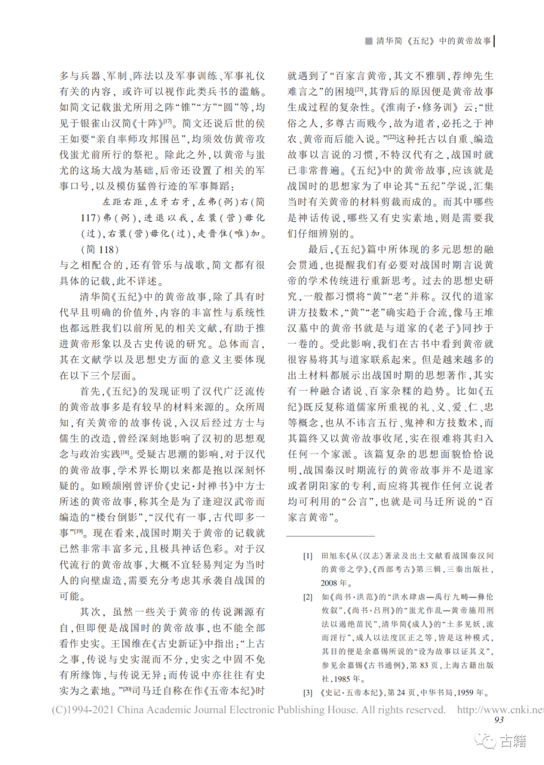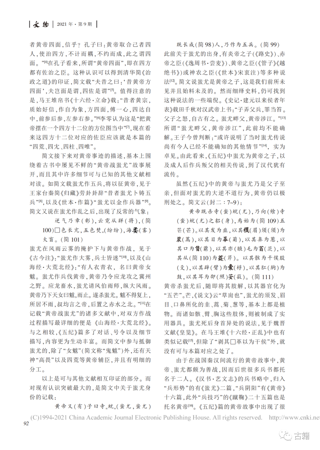 为了说明后帝所建立的这套“五纪”系统切实有效,简文在后四分之一篇幅里,以最初的“人王”黄帝为例,描述了他对这套理论体系的具体践行。里面涉及了大量黄帝时期的历史传说,以及大家熟悉的“黄帝战蚩尤”的故事。其中关于“蚩尤”身份的记载,完全更新了我们的认知,其文曰:“黄帝有子曰蚩尤,蚩尤既长成人,乃作为五兵。”蚩尤是黄帝之子,虽让人始料未及,然传世文献已有所提示,《史记·建元以来侯者年表》载田千秋对汉武帝上书曰:“子弄父兵,罪当笞。父子之怒,自古有之。蚩尤畔父,黄帝涉江。”可见这一说法在汉代仍有流传。简文记载黄帝、蚩尤之战的过程中,还涉及了许多阵法、号令等内容,甚至还有配以管乐的《武壮》《正匡》《奚尚》三首战歌,对研究先秦军事史亦有重要意义。