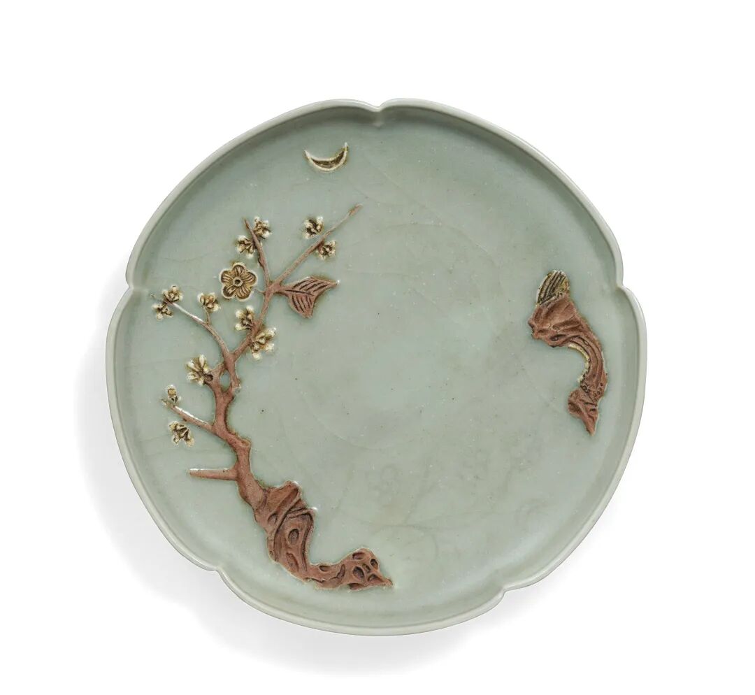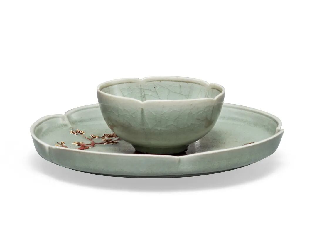 龙泉窑粉青釉露胎冰梅树影盏托一套