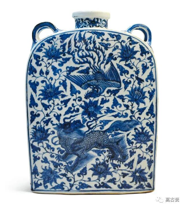 青花凤凰瑞兽穿花纹四系扁方壶