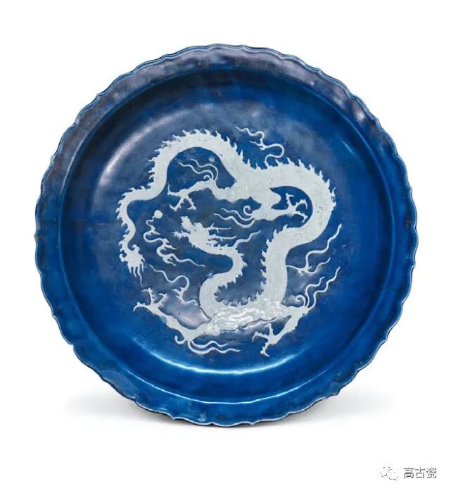 蓝地白花云龙纹菱口盘
