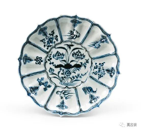 青花莲池杂宝纹莲瓣形盘