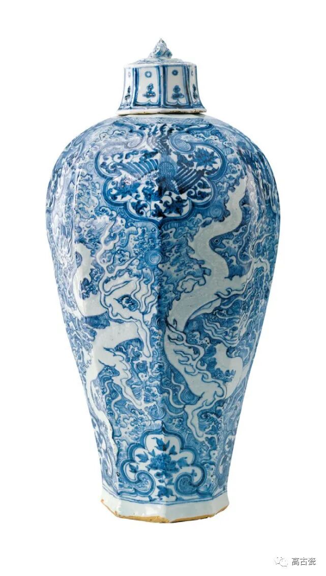 青花海水白花龙纹八棱带盖梅瓶