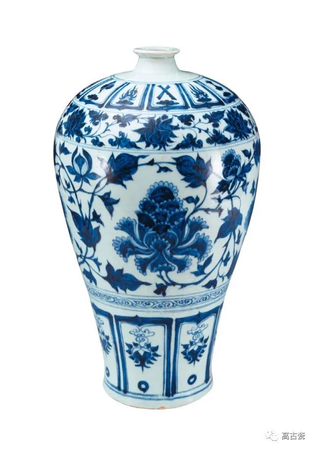 牡丹以其出众的自然姿质和独特的文化内涵,成为元青花花卉图案中的大宗,既可以用在各种器形上为主体纹饰,也可以作为人物故事图案和动物花卉图案的配景和辅助纹饰。作为主体纹饰的牡丹纹多呈宽幅带状地展开于大罐、梅瓶的器腹部,以花茎为主轴线,四至六朵大花等高、等距排列环绕器物一周,雍容华贵 ;或者是以折枝花的形式装饰于玉壶春瓶、葫芦瓶、执壶等器物的腹部,随器伸展,布局丰满,更显精致细腻。作为配景陪衬的牡丹纹也有环带状的,此外还有开光式的和通景式的,以自由活泼、生动自然为趣致。不论是作为主体纹饰还是仅仅作为配景,元青花上的牡丹形态都是那样的丰满而端庄、规范而活泼、典型而鲜明,是元代景德镇工匠在宋代龙泉窑、耀州窑、磁州窑牡丹纹样的基础上发展而来的。绘制时先勾勒纹样轮廓,再在轮廓线内平匀地涂抹青料,花瓣边缘留白处则以淡青料水洗染,层次丰富、明暗有致,使元青花牡丹纹样整体上装饰性很强,构图严谨,色彩饱满,节奏明快,但细微处能体现笔墨意趣,洋溢着旺盛的生命力。